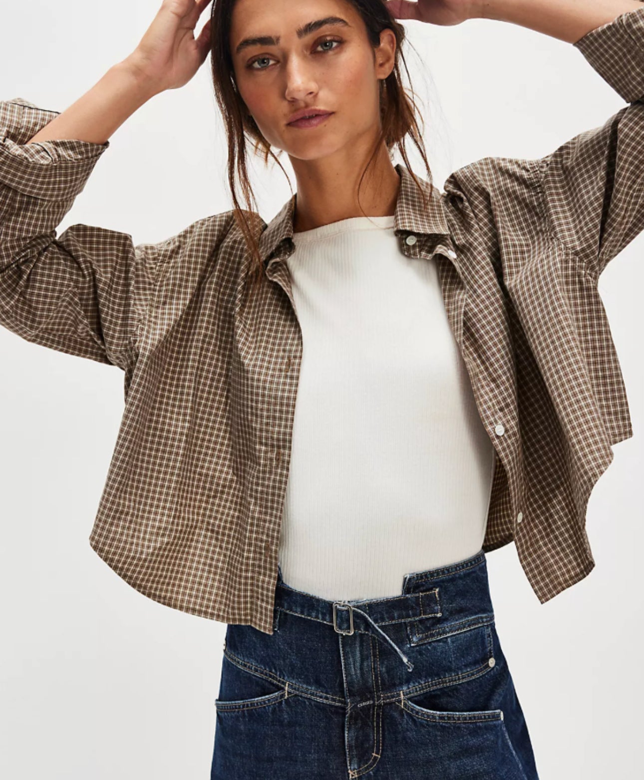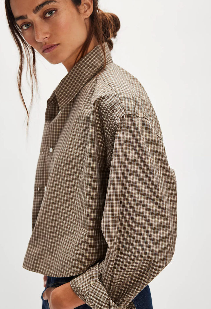 A modern staple with a vintage nod, the Ana shirt is cut from ultra-lightweight Japanese cotton with an airy feel. The cropped silhouette and pointed collar lend sharp structure, while the dark brown and grey micro plaid adds subtle depth. Effortless layered or worn solo with high-rise denim or relaxed trousers. This fit is true to size. Looks Like: Dark brown and grey micro plaid cropped long sleeve shirt with pointed collarFeels Like: Ultra lightweight Japanese cotton with an airy hand   Chest: 50 1/2"Body Length: 19"Shoulder to Shoulder: 19 3/4"Sleeve Length: 22 3/4"Model is 5'10" and wearing a size SmallFabric: 100% CottonCare Instructions: Machine wash cold inside...