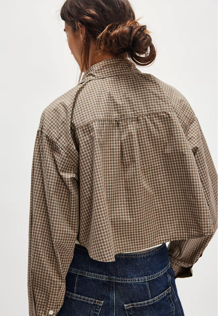 Looks Like: Dark brown and grey micro plaid cropped long sleeve shirt with pointed collar