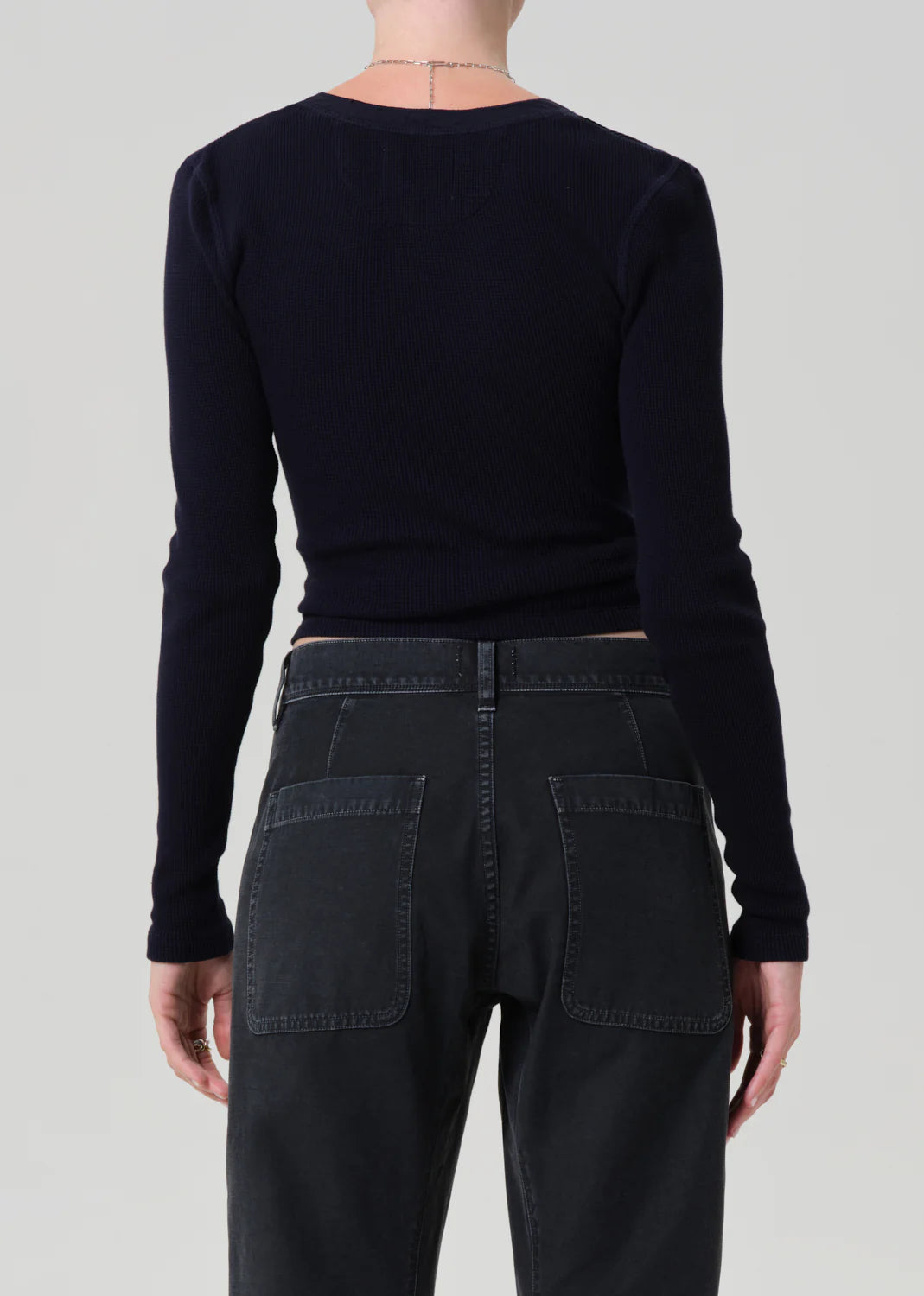 The Drea is a refined henley crafted from ultra-soft regenerative cotton in a textured waffle rib. Designed with a close fit and subtle neckline detailing, it offers supportive stretch and effortless versatility—perfect on its own or layered under your favorite pieces.