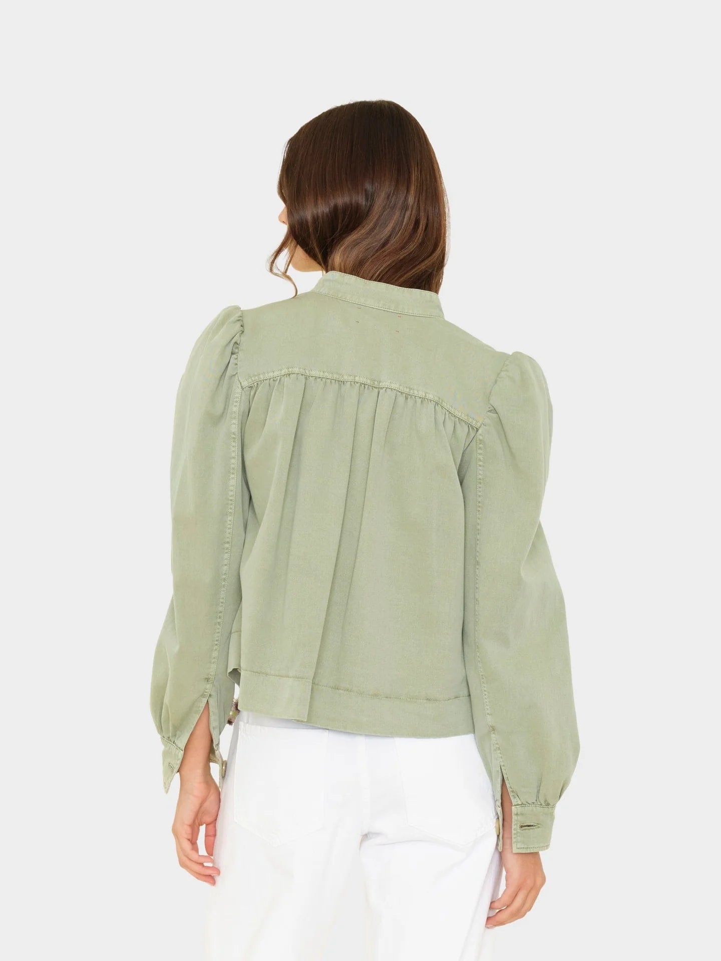 Sonny is new this season in our vintage washed cotton twill. This pleated jacket features a faux horn button-front, shirred blouson sleeves, and front welt pockets. Doheny Twill 100% Cotton, Lining: 100% Cotton