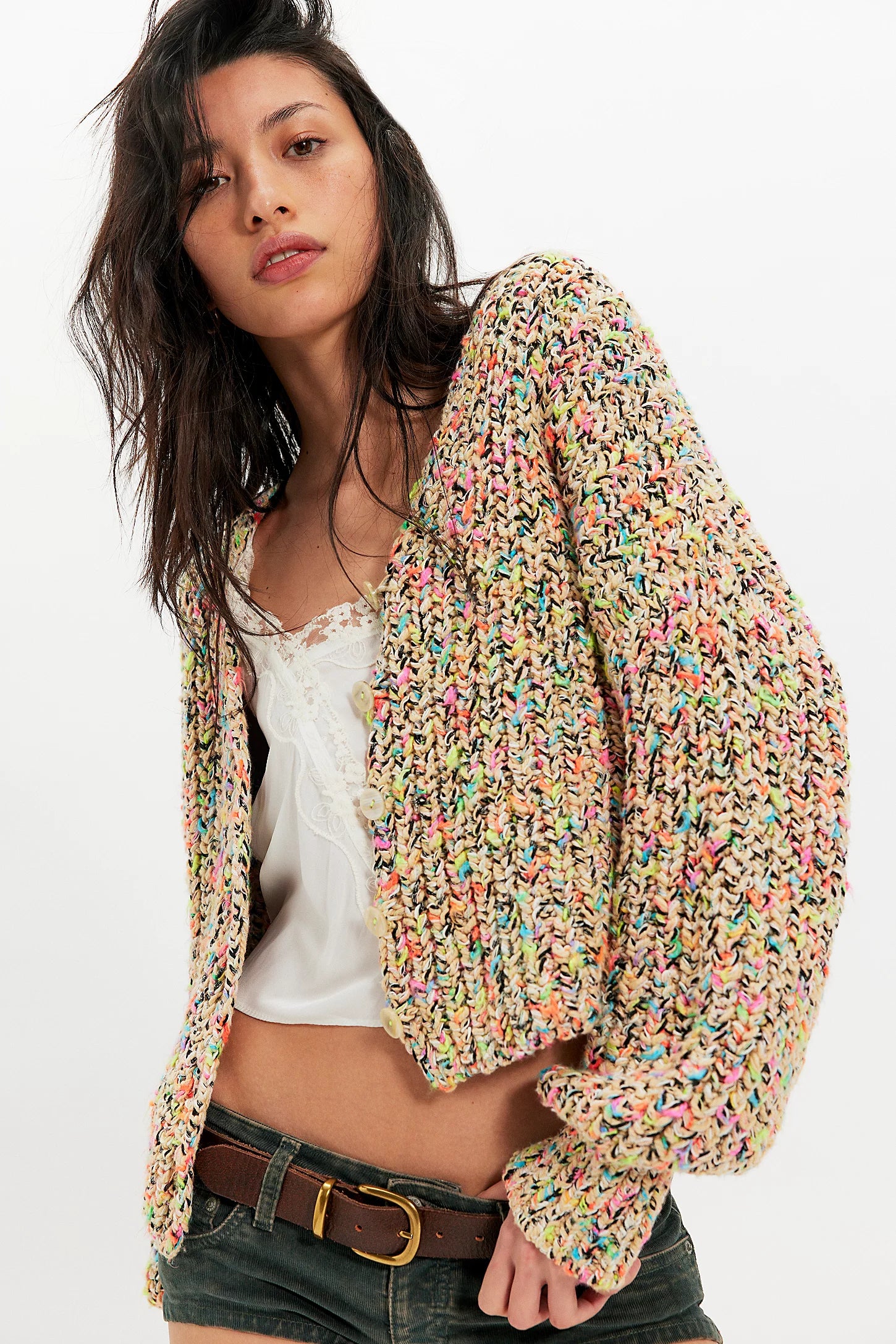 Elevate your sweater collection with this bold cardi, featuring a cropped, slouchy silhouette, a contrasting knit design, and a lightweight cotton-blend fabrication.