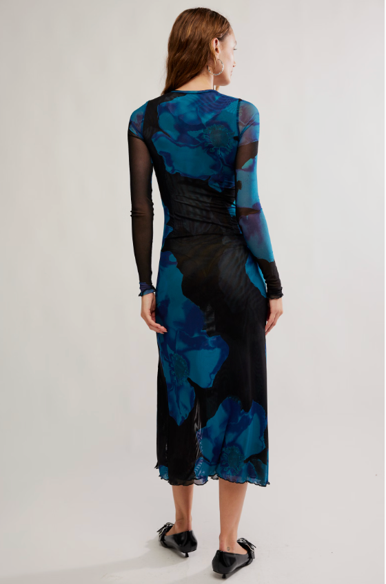 Femme and flattering, this maxi features a printed mesh fabrication and long-sleeve silhouette with gathered waist detailing and an exaggerated slit.