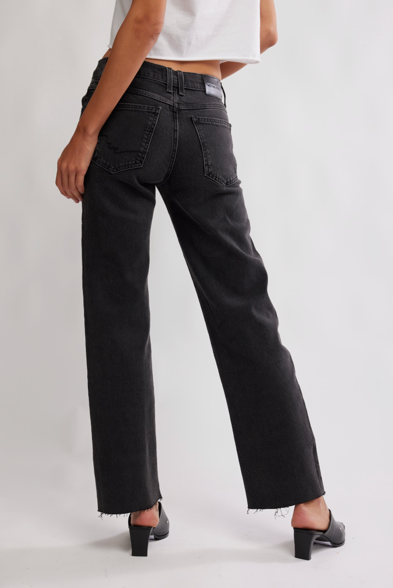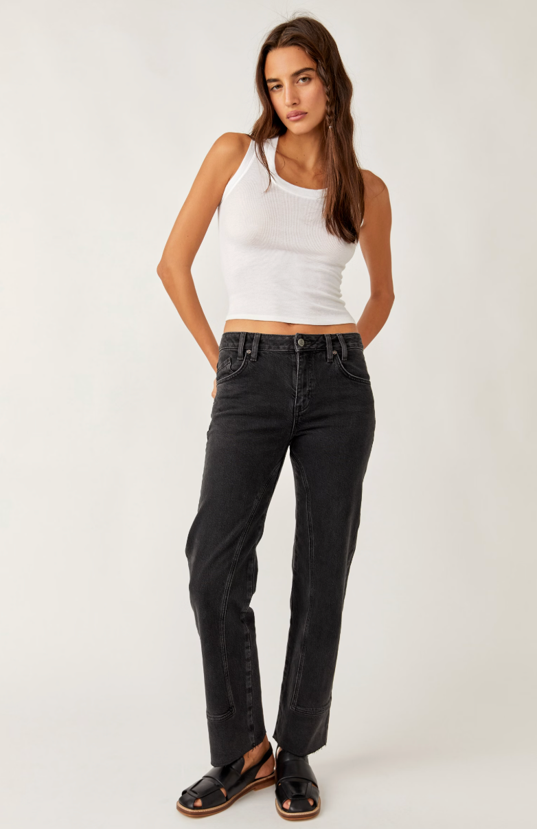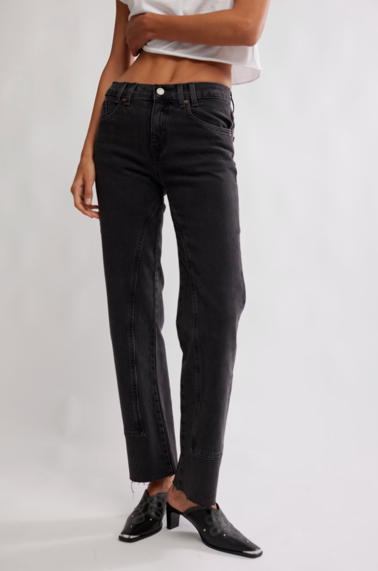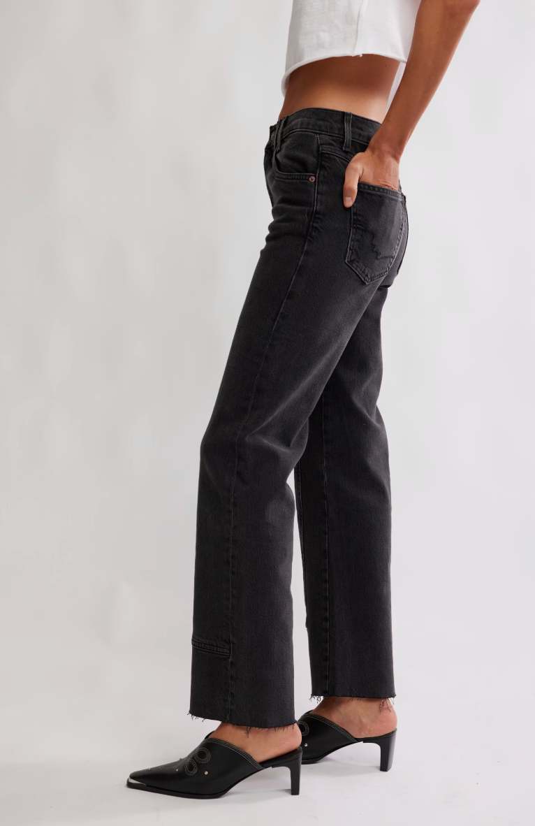 Fit: Mid-rise, true straight silhouette with semi-rigid denim