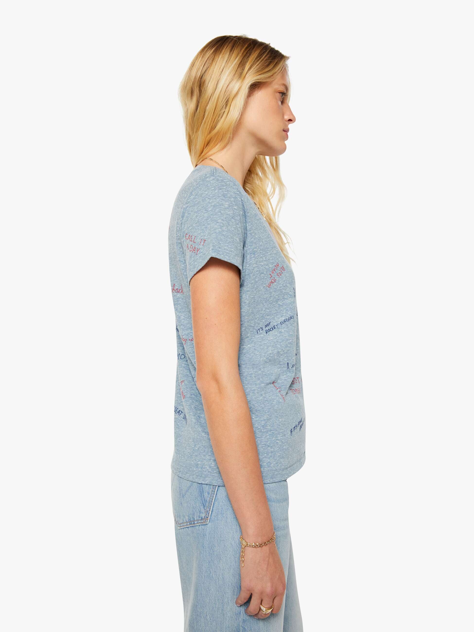 It says without going. A soft crewneck with a slim fit for a vintage look and feel. Made from a cotton blend in overdyed blue, The Boxy Goodie Goodie in Tongue Tied features printed text in red, yellow and blue throughout.