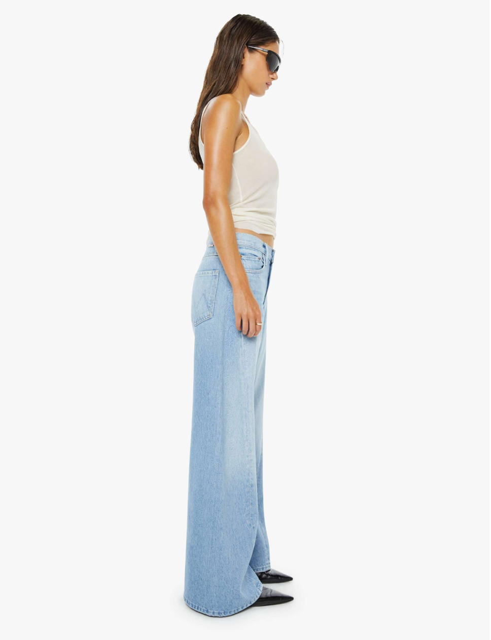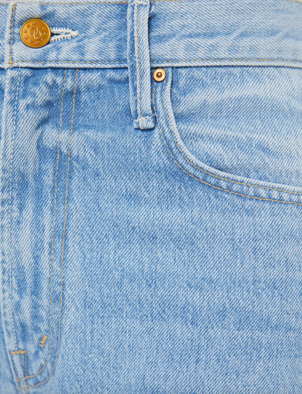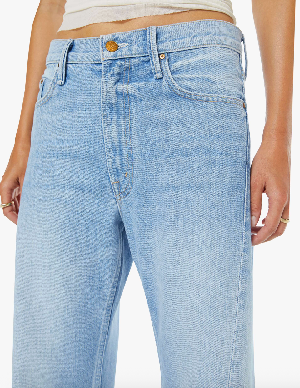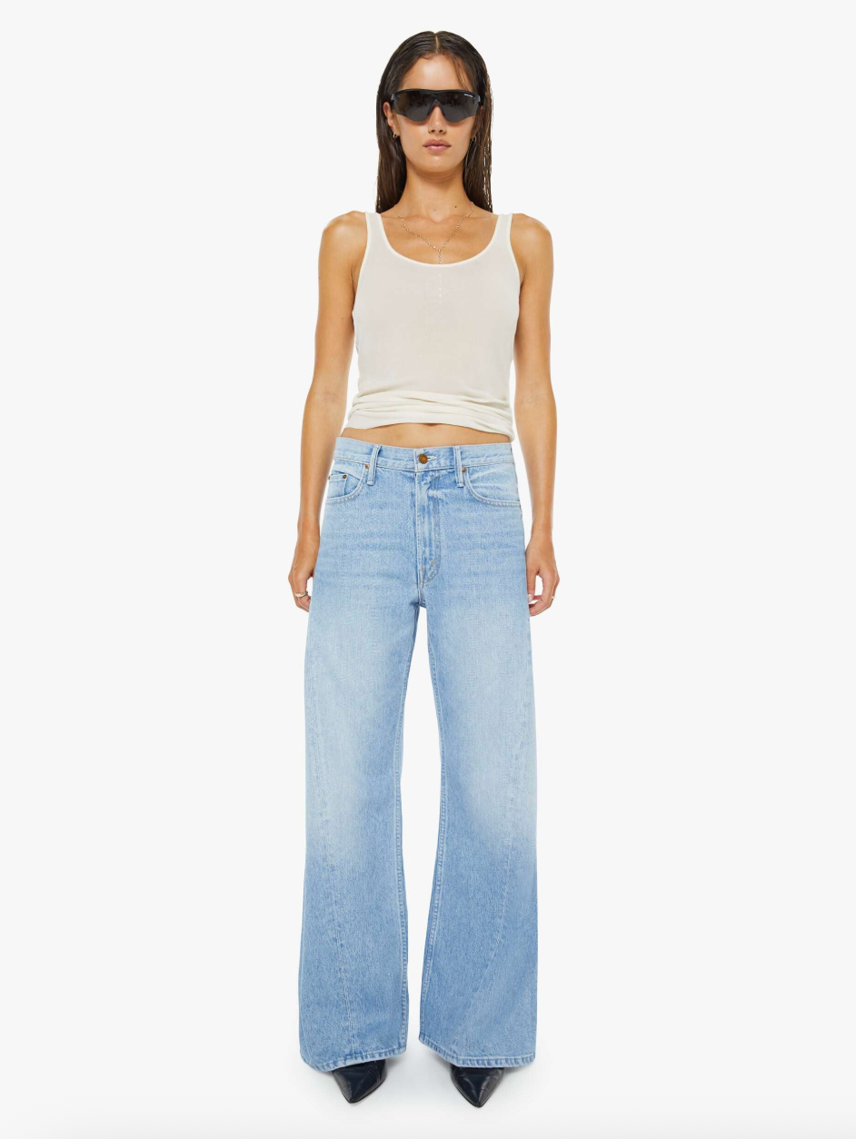 Wide leg jeans from SNACKS!, a collection of unconstrained silhouettes leaning into exaggerated shapes and extreme proportions. Experimental and non-era specific. For everyone, or not. Designed to sit on the hips with a slouchy fit, these high rise jeans have a zip fly, loose wide leg with a curved outer seam and a 31-inch inseam with a clean hem. Made from a rigid recycled cotton blend, Munchies is a light blue with subtle whiskering, fading at the knees, a pretzel-detailed button and candy-inspired interior rivets. Would you like a treat? MOTHER says it's OK to slouch. This style is intended...