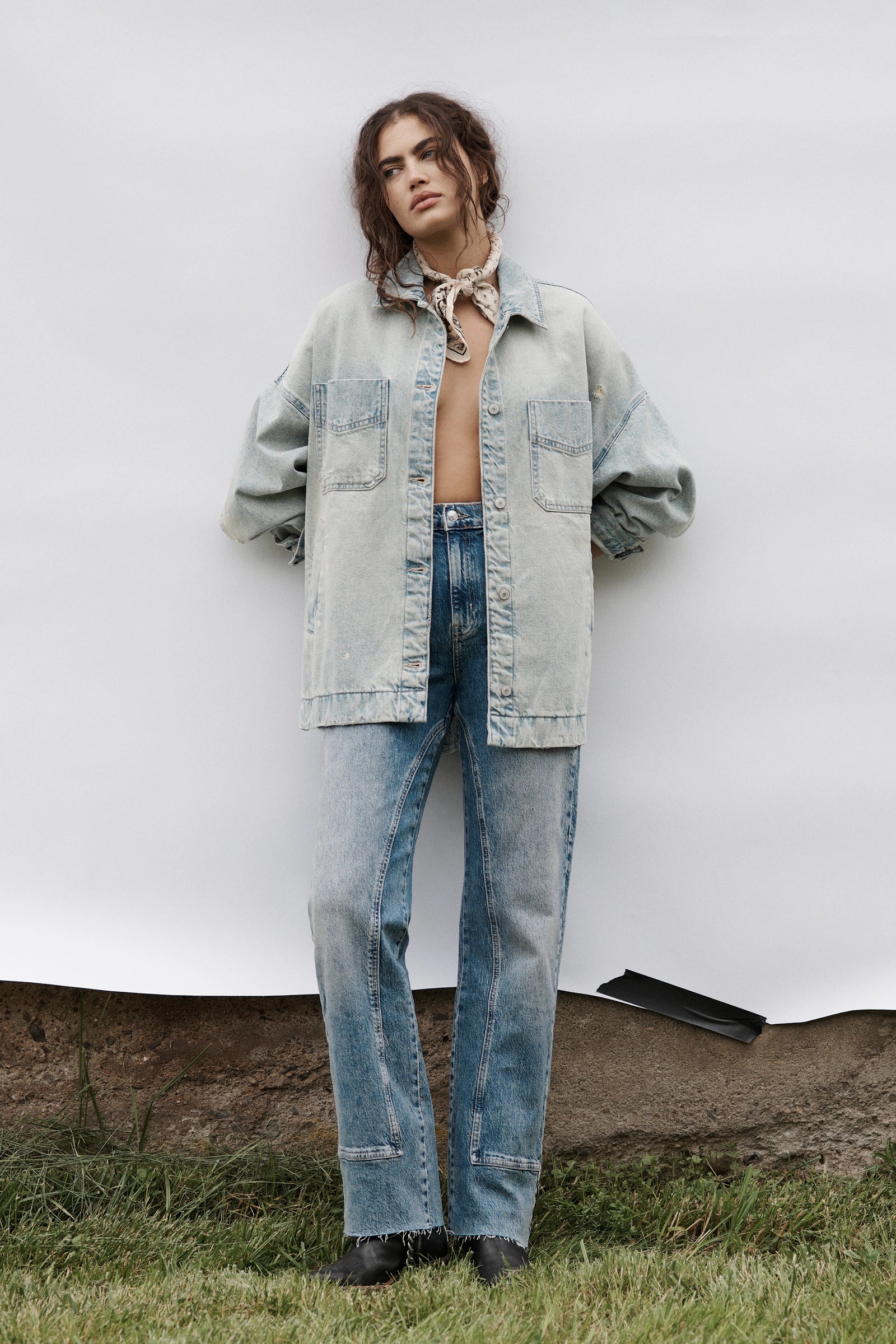 Features: Zip fly and button closure, five-pocket design, ankle-length inseam with frayed hem, utility seaming throughout