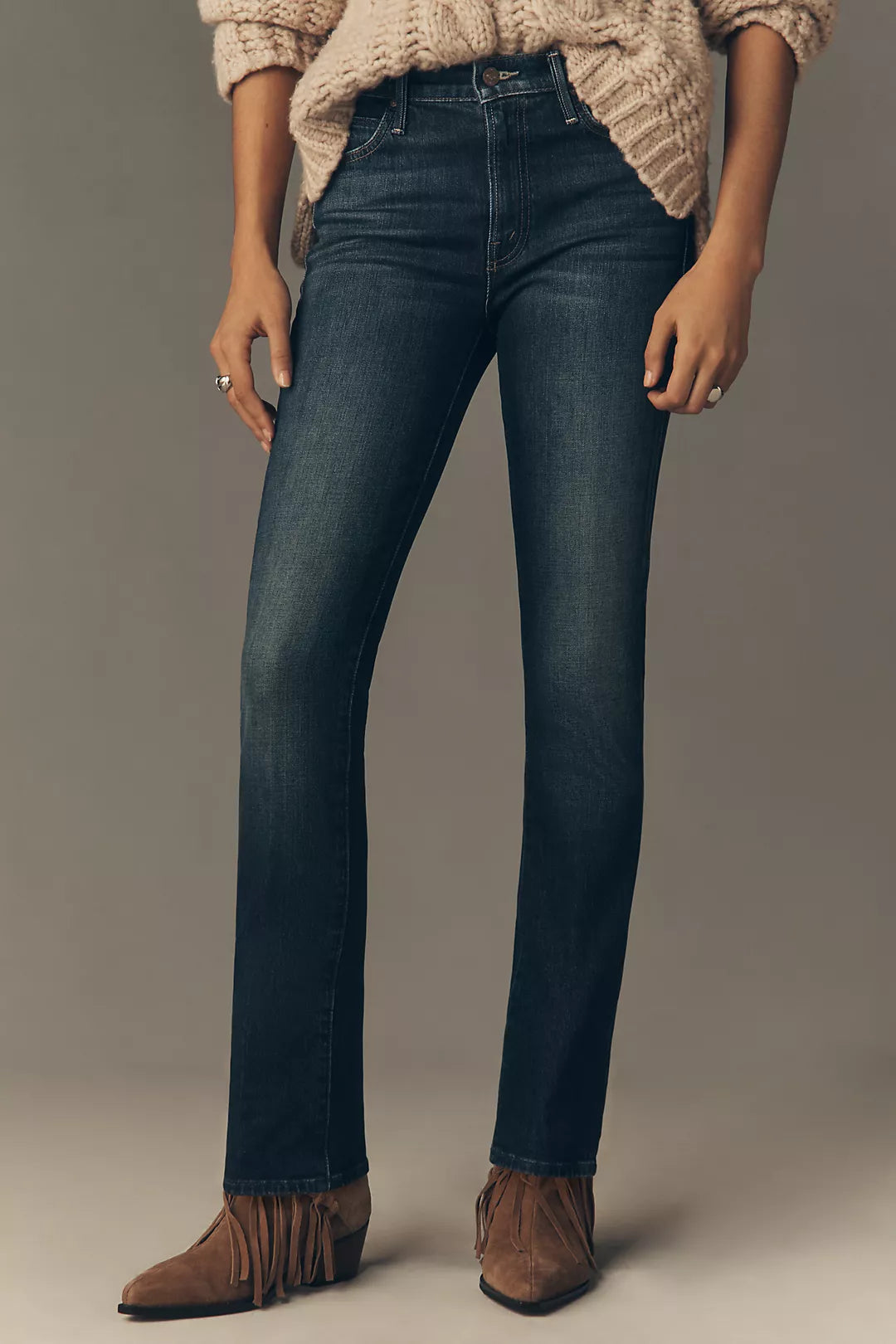 Star power. A mid-rise straight leg with a zip fly, long 31-inch inseam and a clean hem. Made from denim with a touch of stretch, Shine On is a dark blue with whiskering and fading at the knees. 9 2/4" Rise31" Inseam13 3/4" Leg Opening