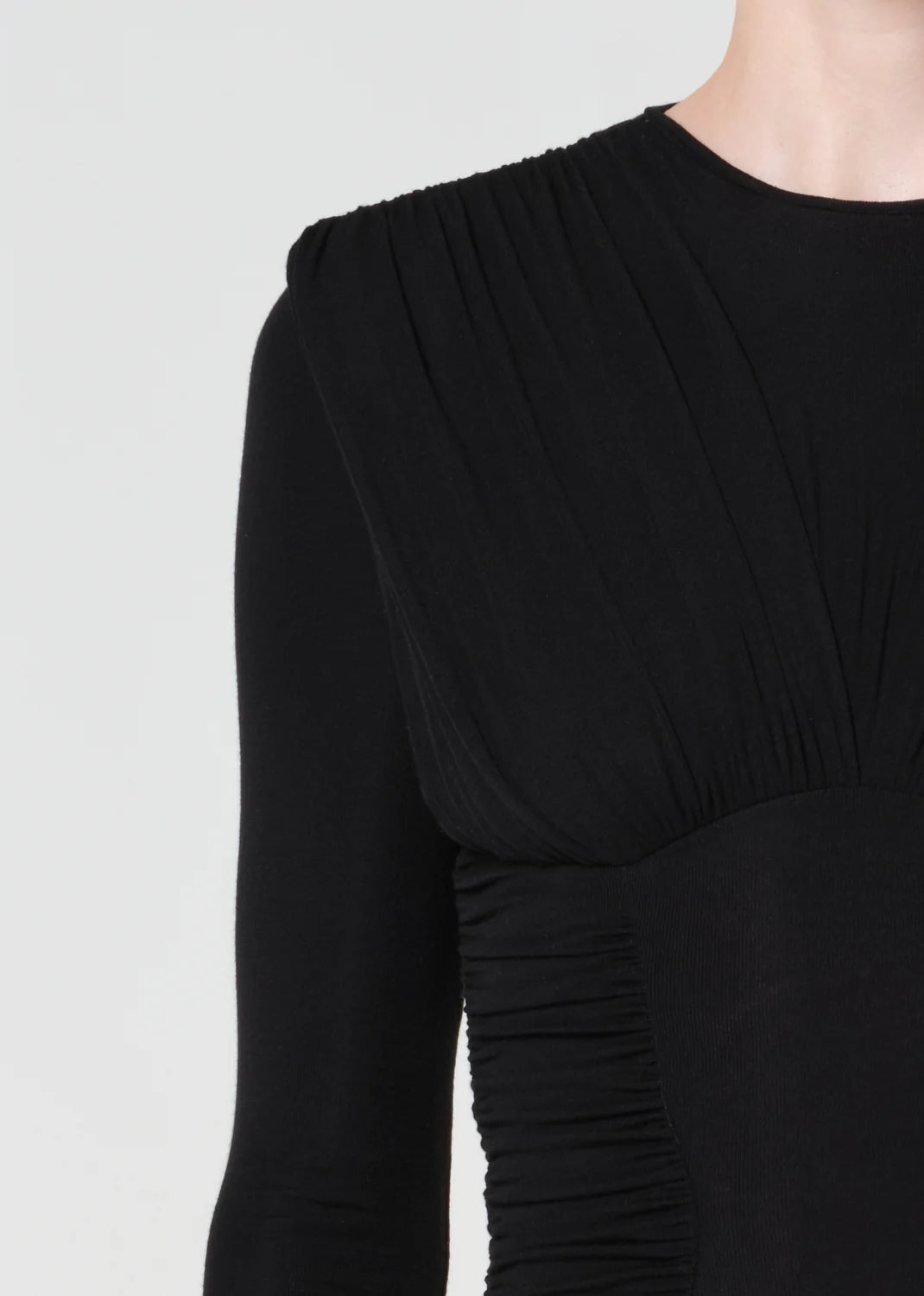 The Abbi Dress is a sleek long sleeve silhouette with subtle ruching for a flattering fit. Cut from ultra-soft lightweight baby rib, it offers gentle stretch and all-day comfort. A versatile essential that pairs effortlessly with boots or layered under jackets.