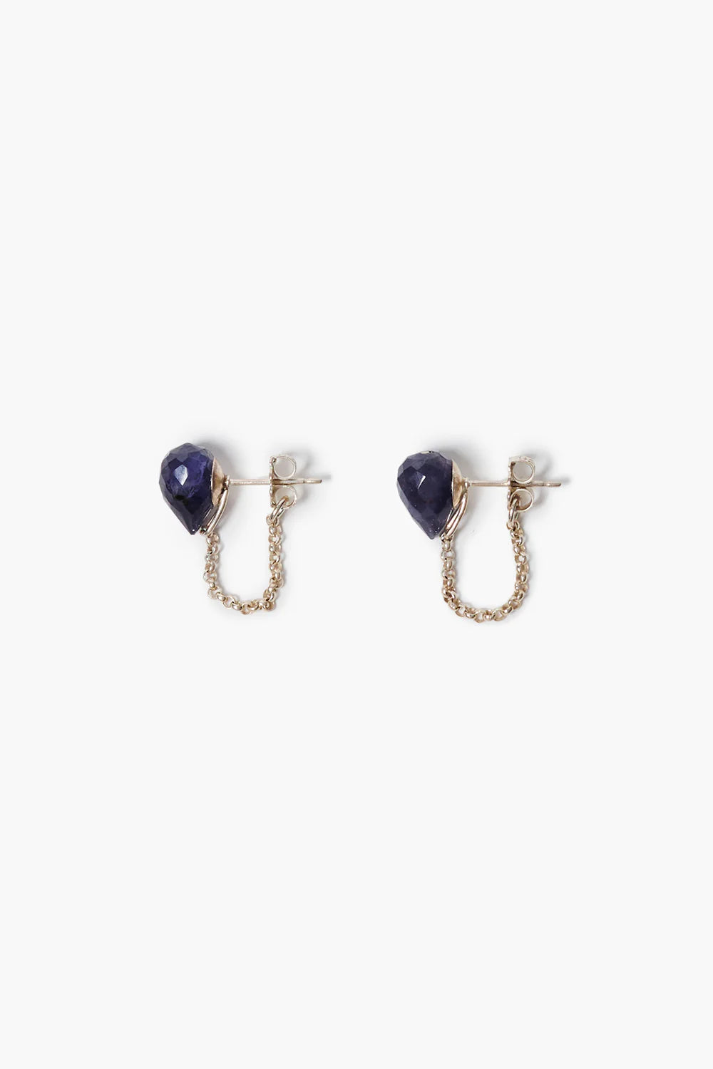 Sterling silver earrings featuring faceted iolite with chain loop attachments on the post backs.