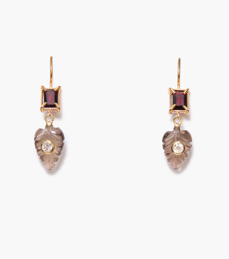 18K gold plated sterling silver earrings featuring garnet and smokey quartz with white topaz inlay on French hooks. 1 3/8in. drop.