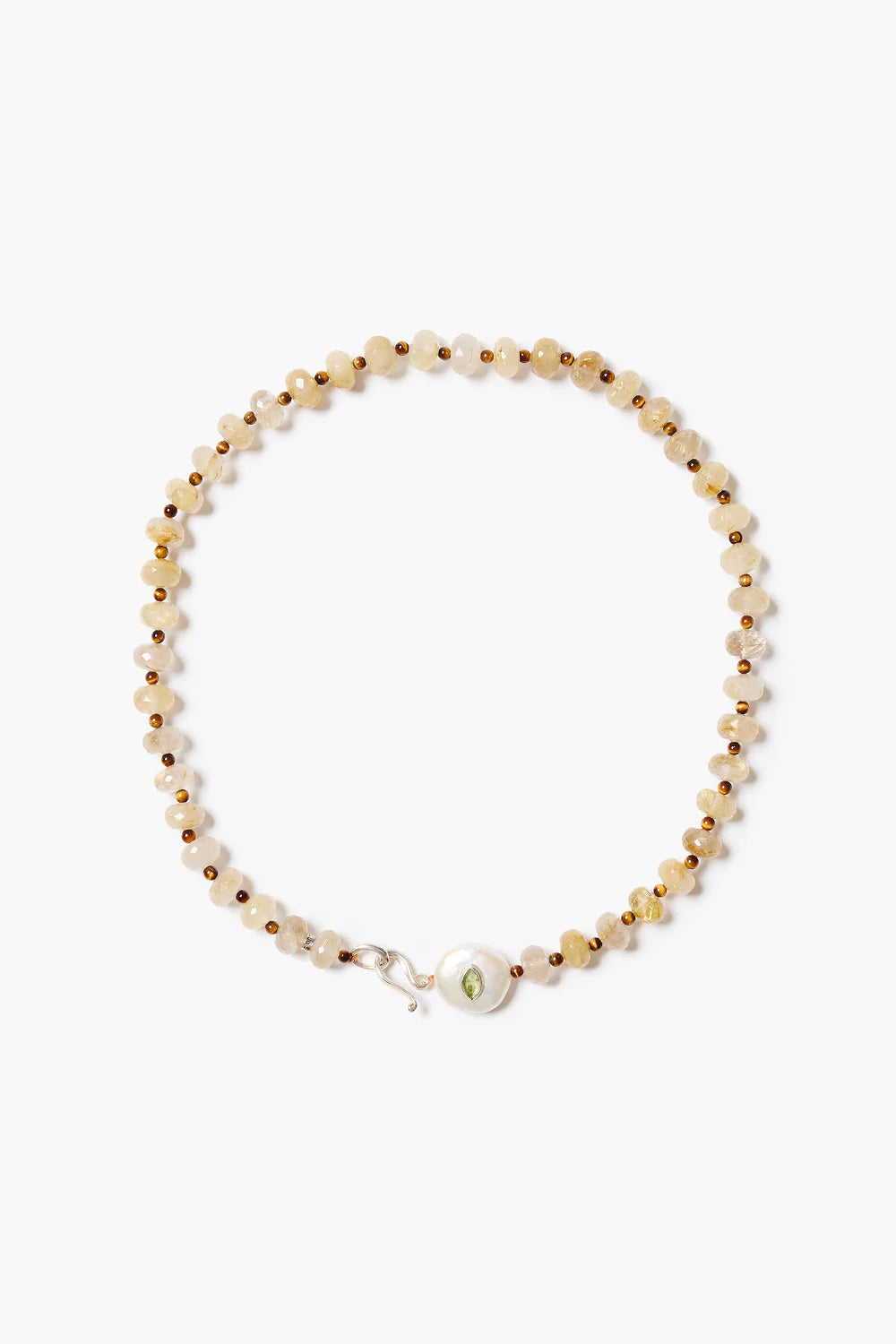 The Gaze Necklace showcases a white pearl coin with a peridot marquise accent on a strand of rutilated quartz and tiger's eye beads.