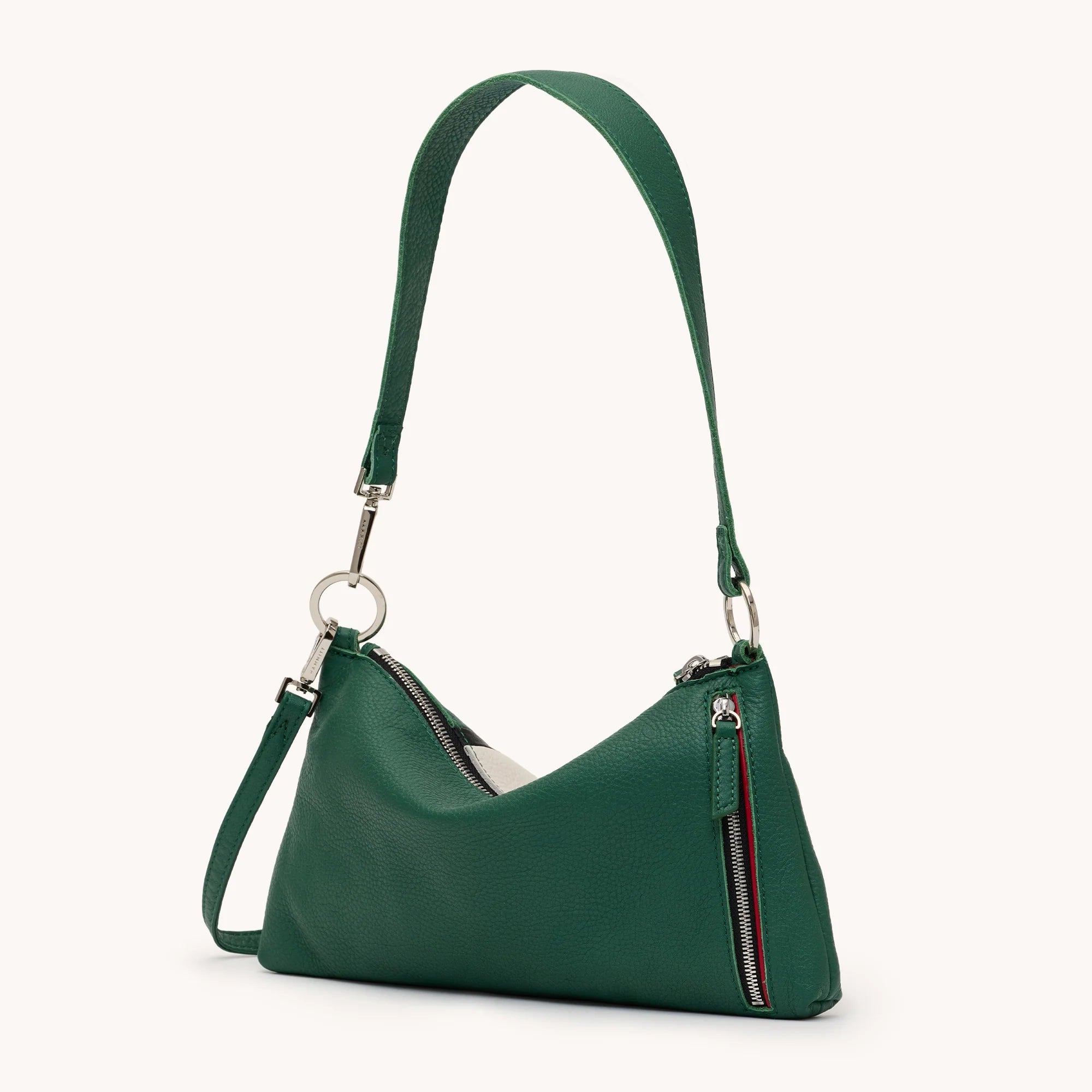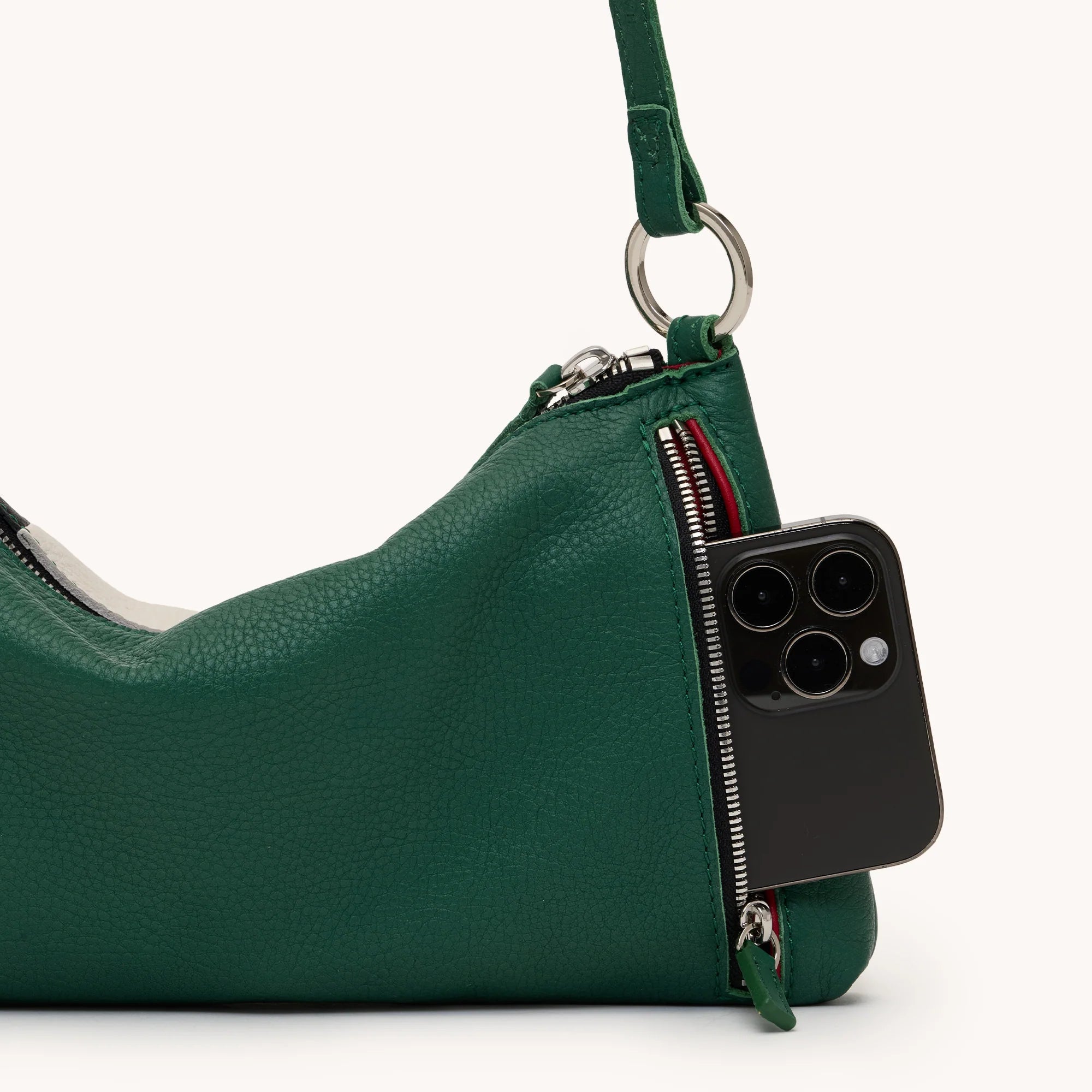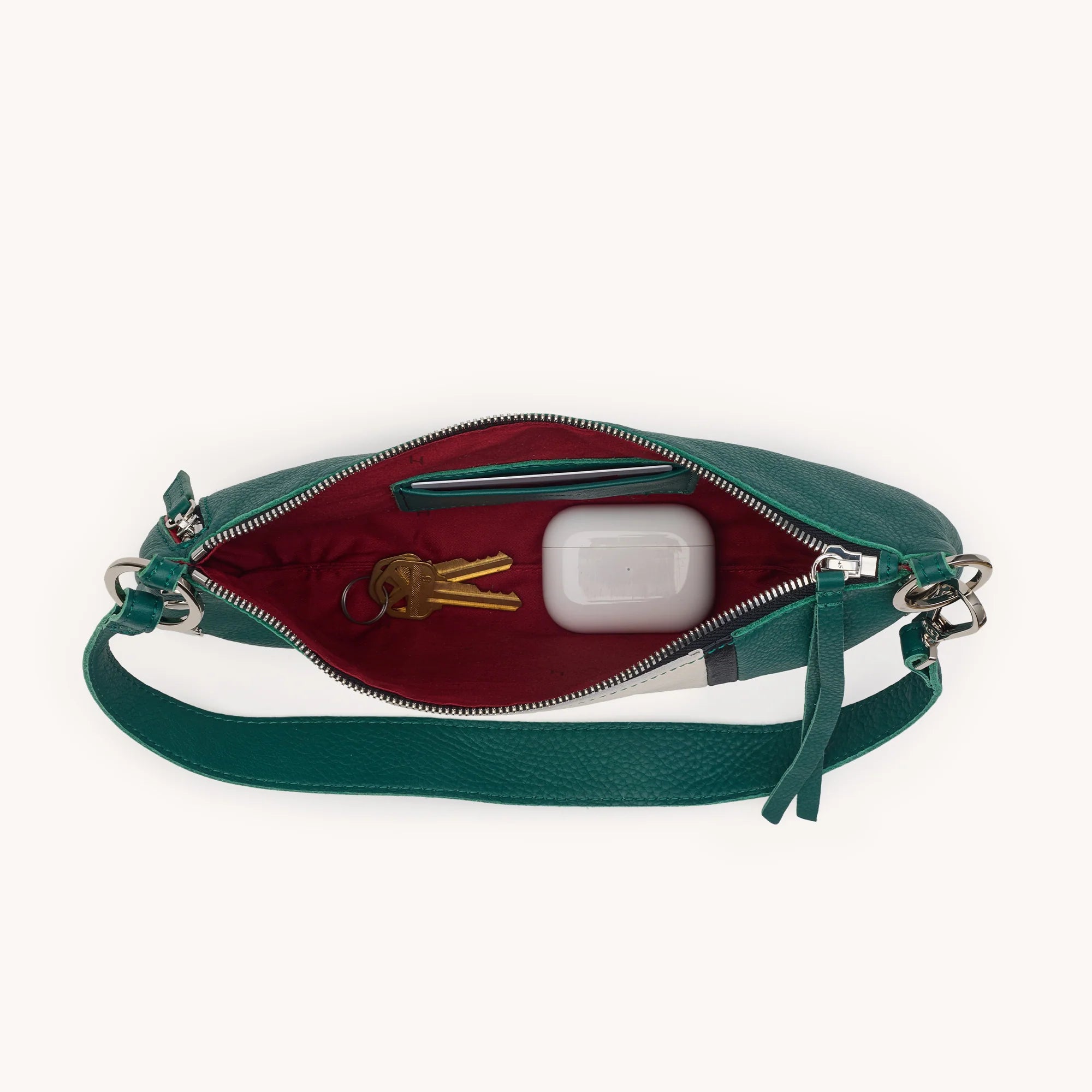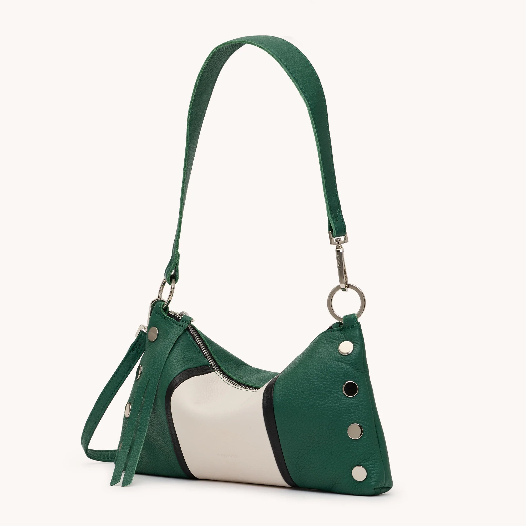 This fresh, of-the-moment bag is a must-have companion for nights on the town. Featuring a slouchy but current shape, this versatile little number transitions from a wristlet to a shoulder bag in seconds flat. The Kyle also includes a removable and adjustable crossbody strap so you can go hands-free. Wear Kyle three ways - as a crossbody bag, shoulder bag, or wristlet. Crafted with a rich, lush green pebble leather with classic black and calla lily white paneling and piping details Shiny silver hardware Can be worn 3 ways: Crossbody, Shoulder Bag, and Wristlet