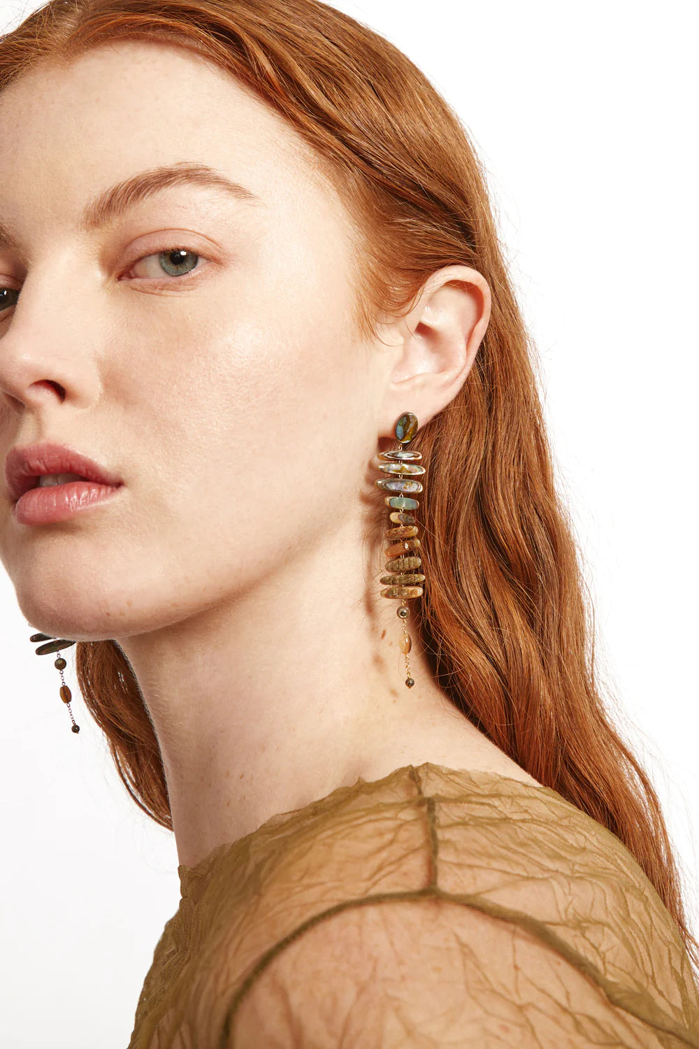 Iridiscent abalone forms a flowing appearance in these striking chandelier earrings. A statement design perfect on its own.