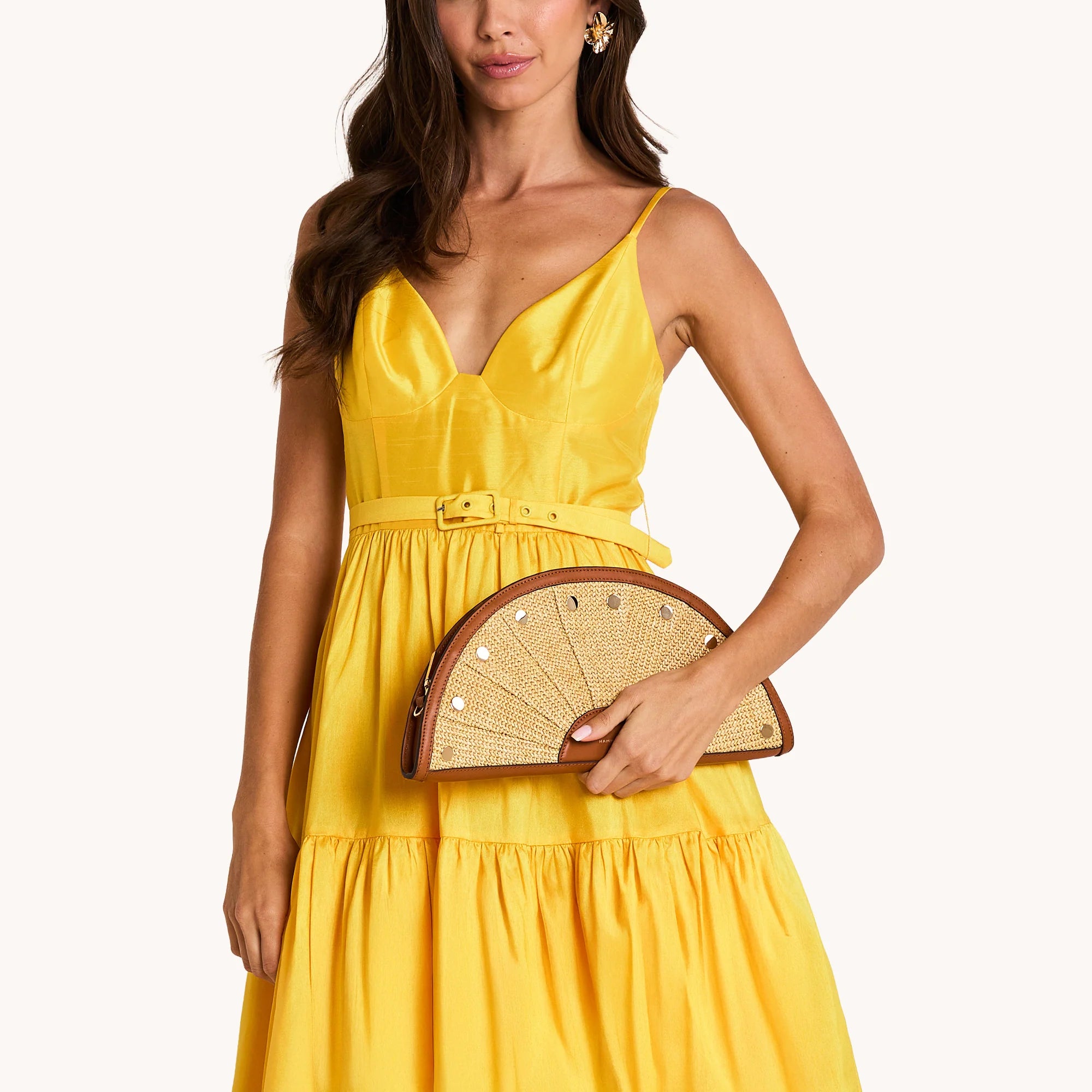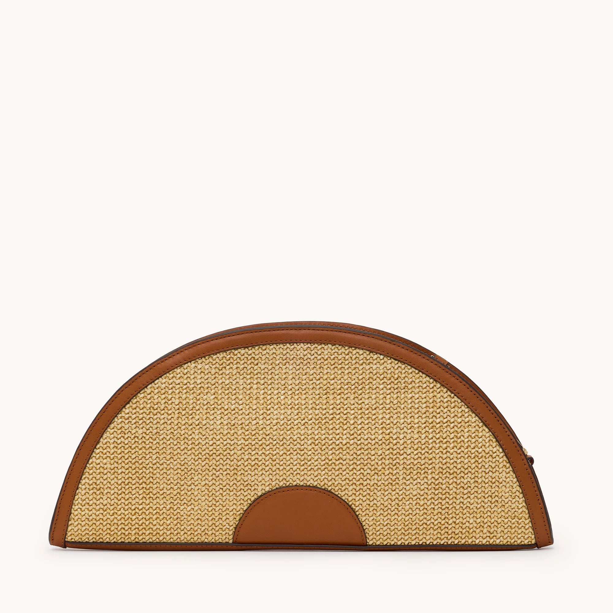 Introducing the Shelley Clutch – an oversized, structured statement piece inspired by the graceful curves of seashells and handmade fans. With its striking paneling and voluminous pleated silhouette, this clutch is designed to turn heads and is perfect for special occasions or adding a unique touch to your everyday looks. Both versatile and functional, the Shelley can be hand-carried, tucked under your arm, or worn as a crossbody with the detachable strap. The D-ring attachment on the left exterior offers endless personalization possibilities, making this clutch just as unique as you. Crafted with a combination of chaparral raffia, medium tone tan brown pebbled leather and mosaic brown pebbled leather Shiny gold hardware Can be worn 3 ways: Hand-carried, tucked under your arm, or as a shoulder bag