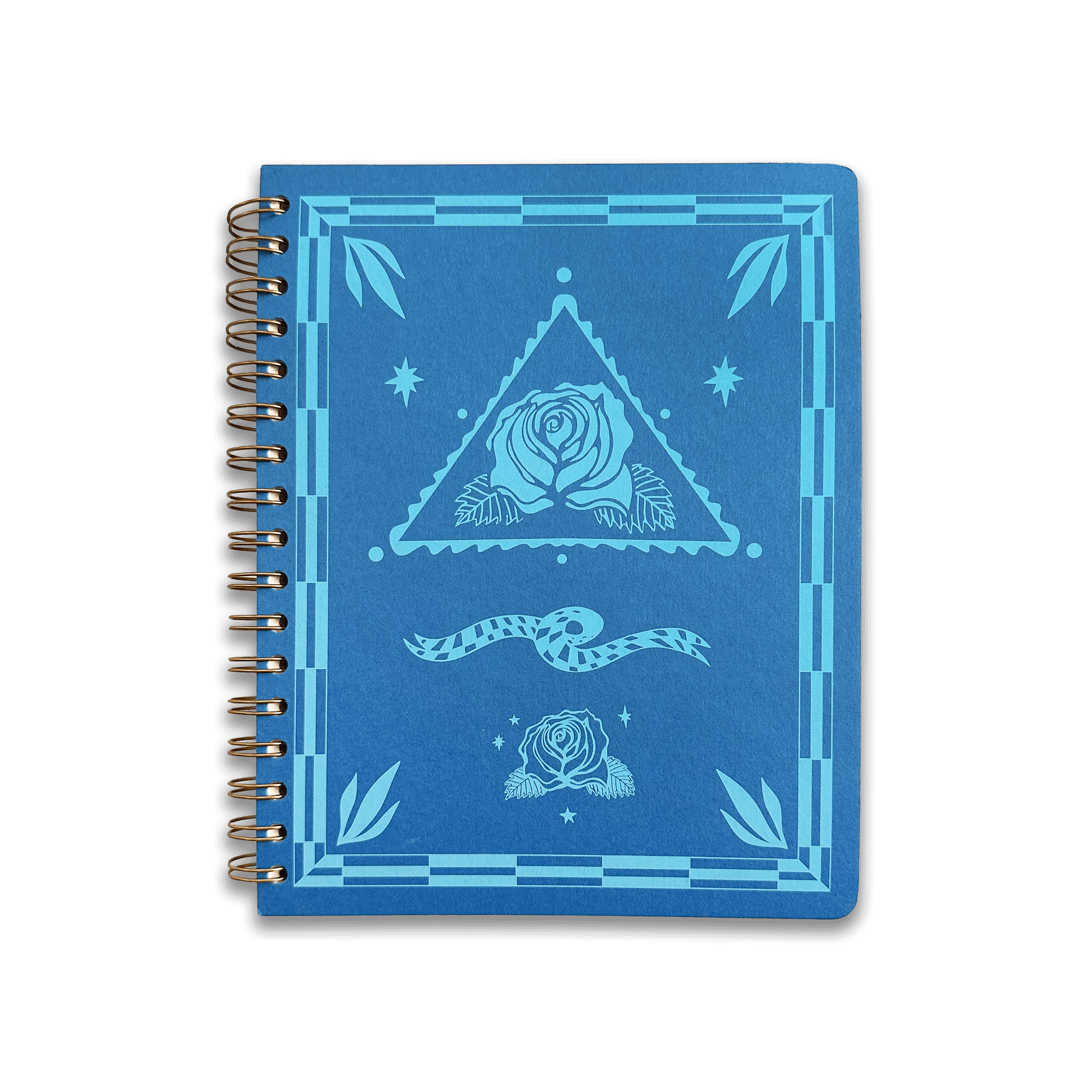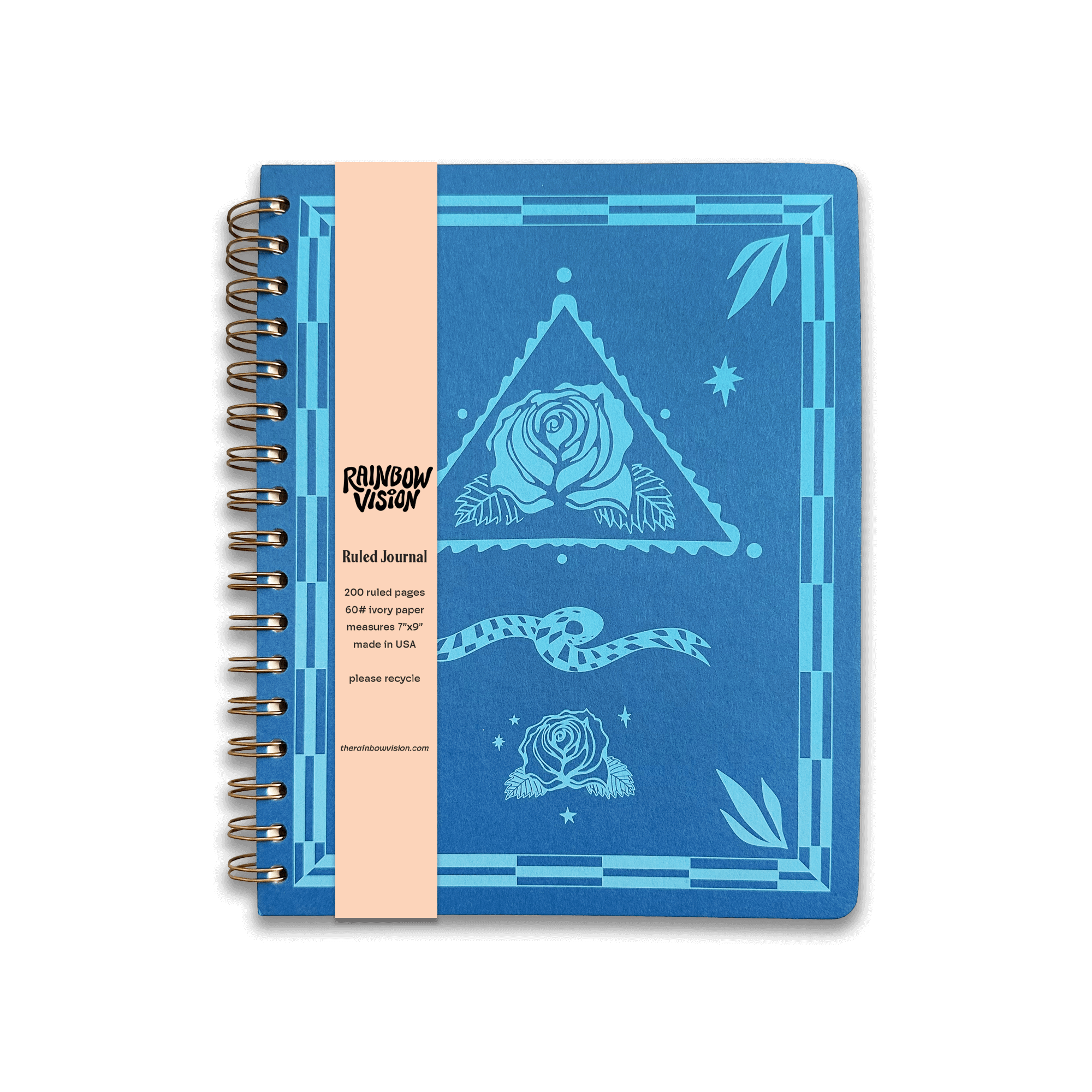 Our NEW 'Rare Rose' design to keep us reaching for that ultimate mystery. Use this journal to record your thoughts, dreams, and to plan out your special projects. * measures 7"x9" * wire bound with a bronze coated steel wire * 200 ruled pages in 60# ivory paper * cover is screen printed in a sky blue ink on a sturdy, sapphire blue cover stock. * Designed by The Rainbow Vision and made in the US.