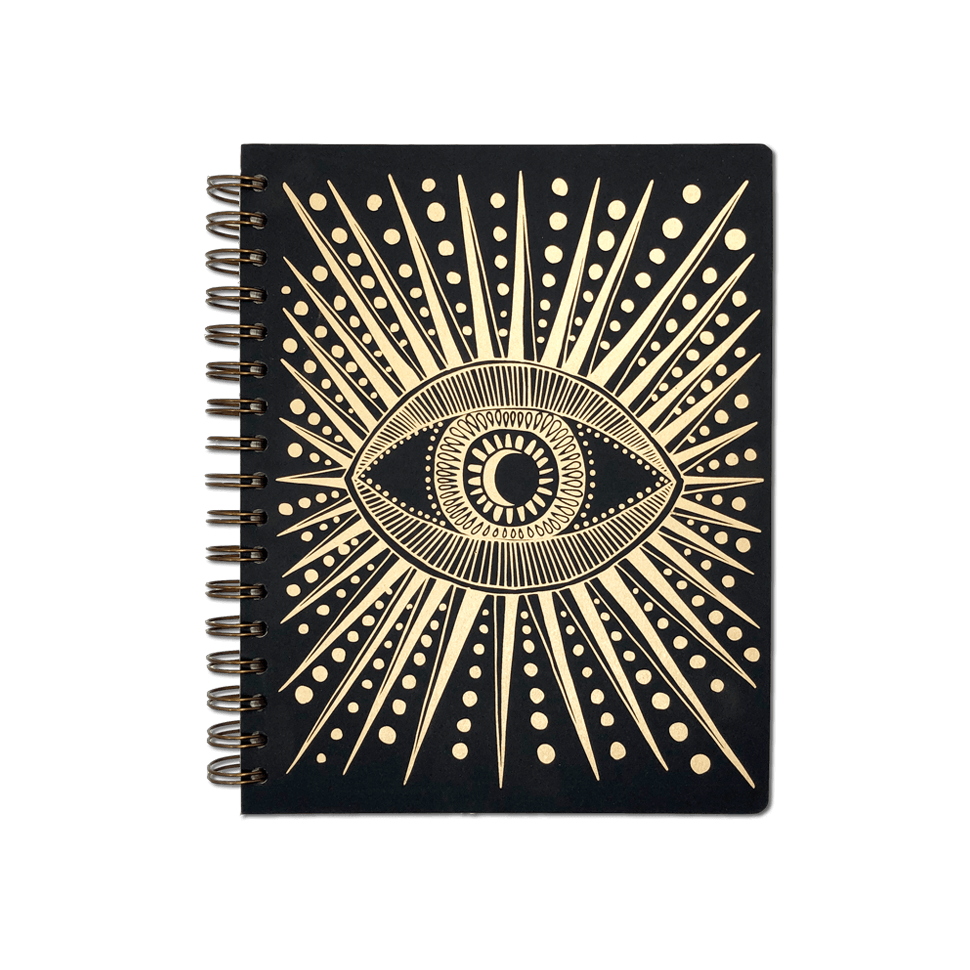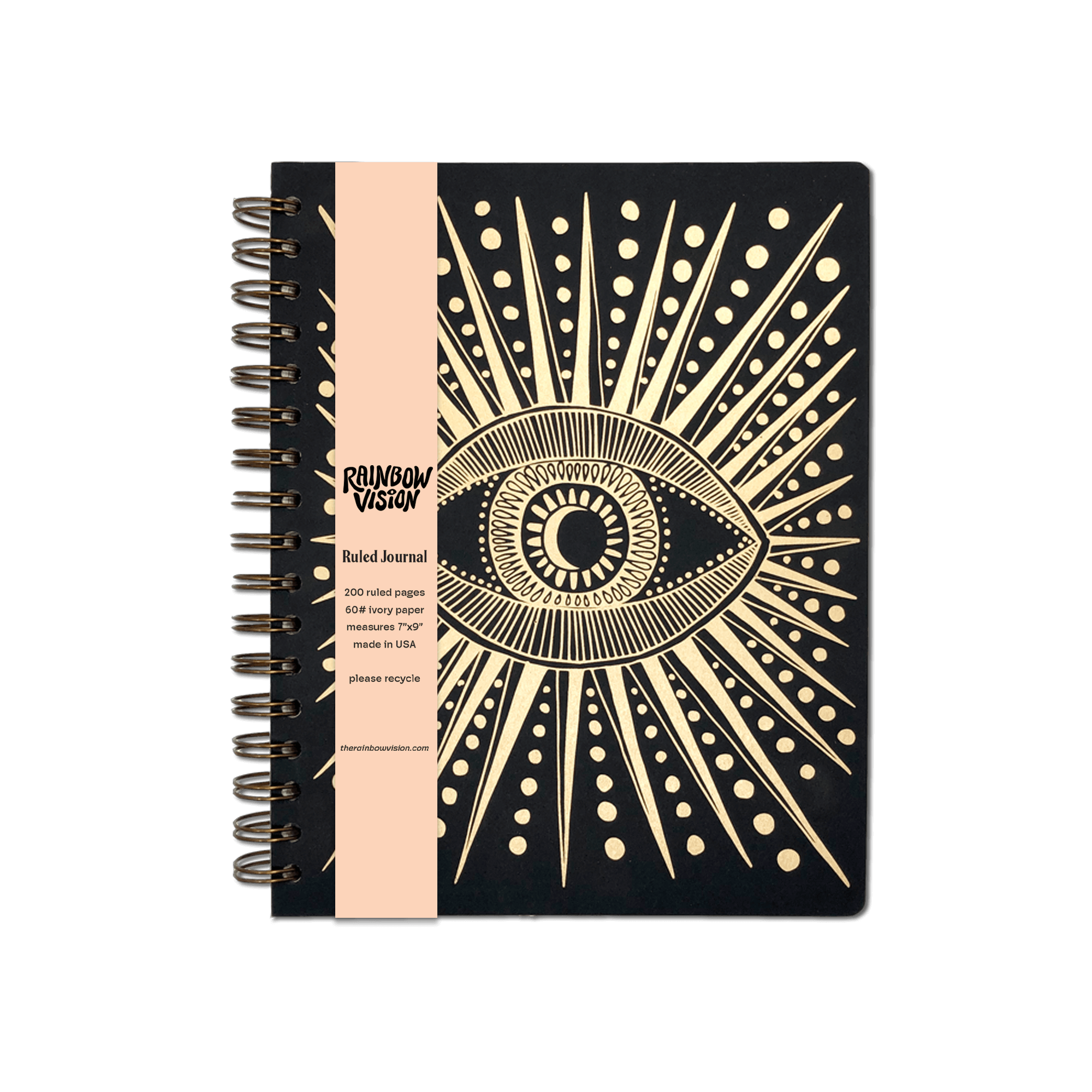 Our classic Seeing Eye design to keep the vibrations high throughout your day. Use this journal to record your thoughts, dreams, and to plan out your special projects. * measures 7"x9" * wire bound with a bronze coated steel wire * 200 ruled pages in 60# ivory paper * cover is foil stamped in matte gold on a sturdy, black cover stock. Designed by The Rainbow Vision and made in the US.