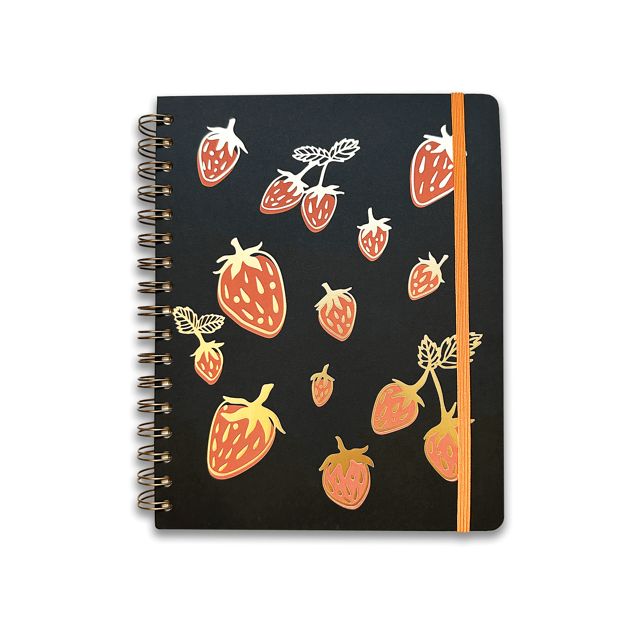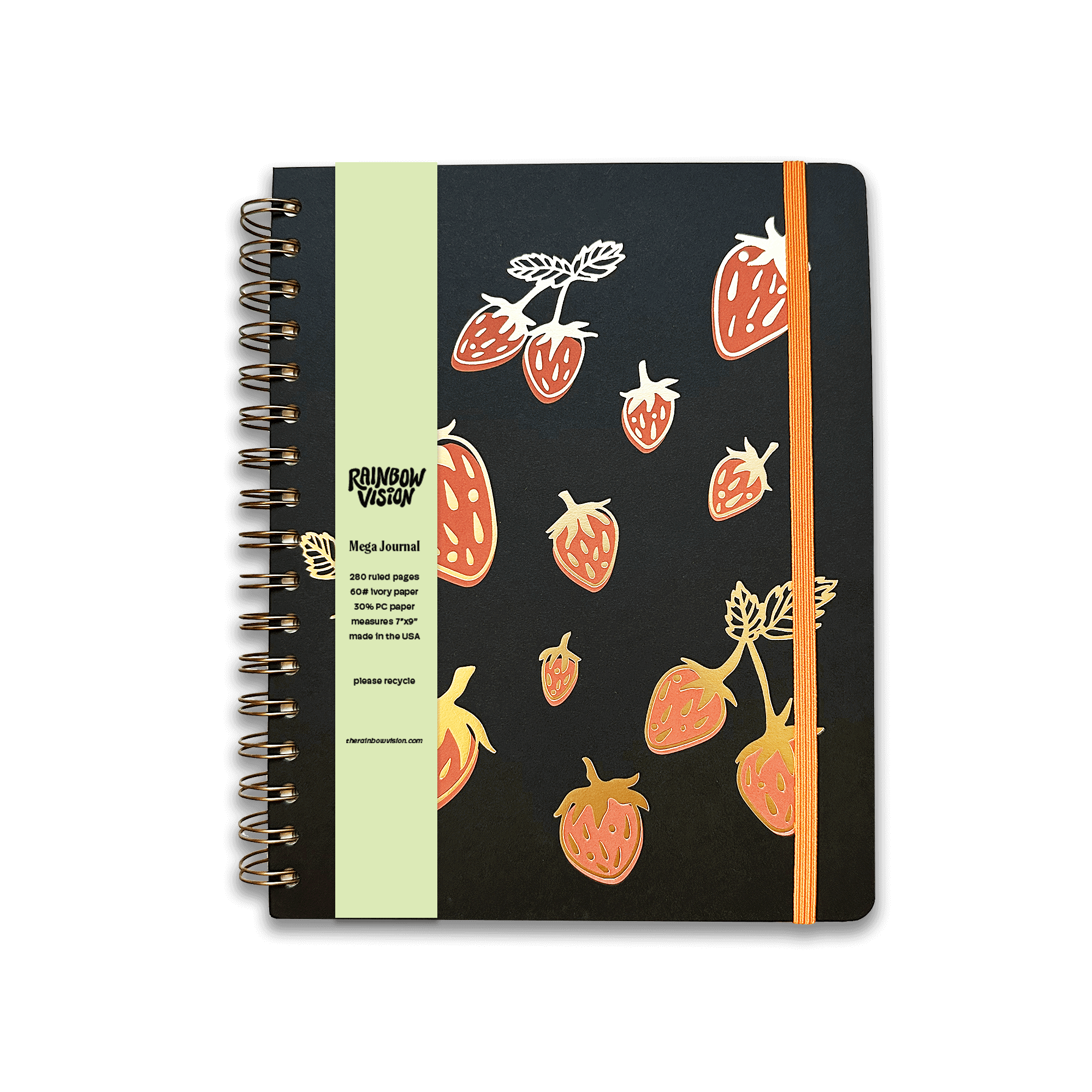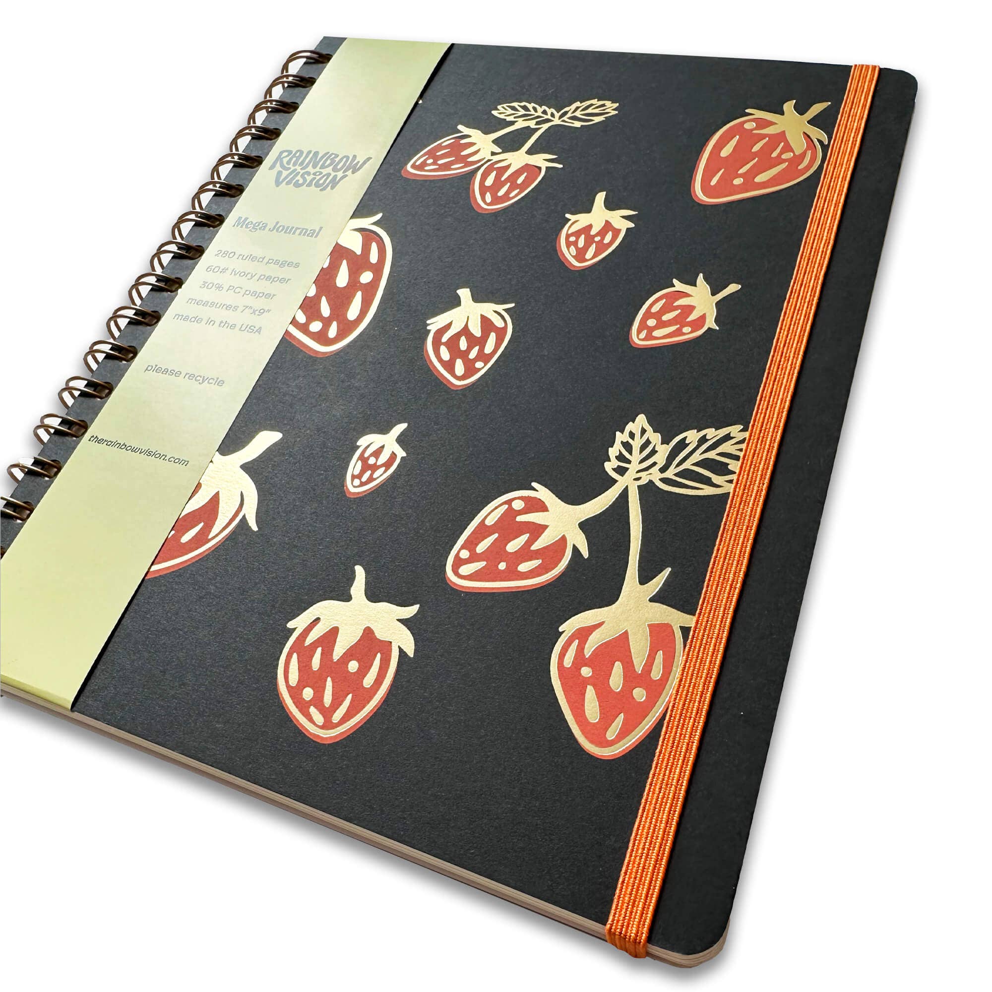 Introducing our brand NEW 'Mega Journal' featuring a strawberry design for spring. This is an even fancier and thicker version of our standard journals with added cover detailing and 80 more pages. These are great for those that love a nice thick journal or notebook to keep by their side for the long haul. * measures 7"x9" * wire bound with a bronze coated steel wire * 280 ruled pages (vs. our regular journals which have 200 pages) in 60# ivory paper, printed on 30% PC paper * elastic band closure * cover is screen printed and then foil stamped...