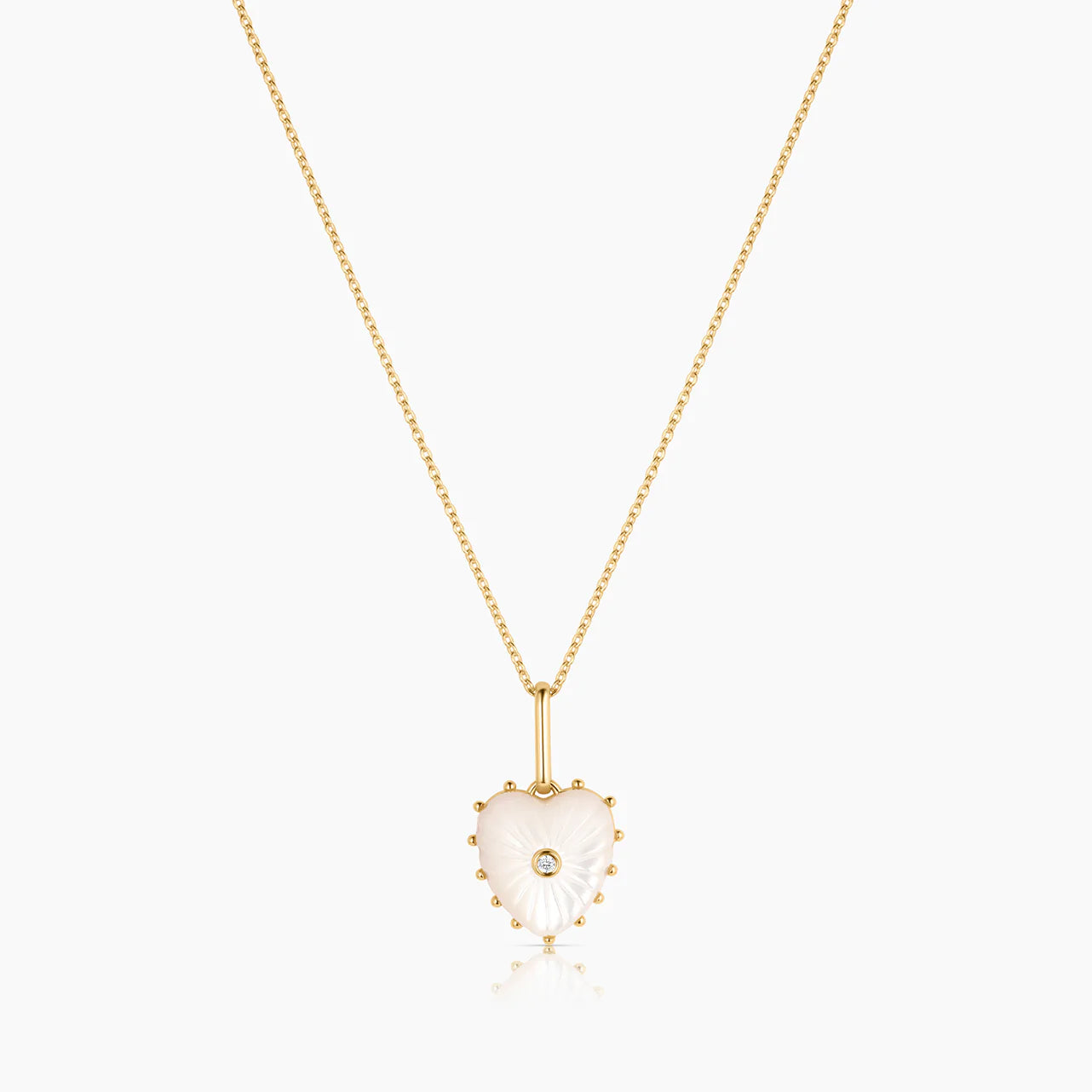 She's Malene's baby sister, a smaller hand-carved mother of pearl heart charm with a sparkling center stone. A favorite for gifting and layering.14k gold plated, hand-carved mother of pearl, cubic zirconia. Rae cable chain necklace 14k gold plated 16-18"
