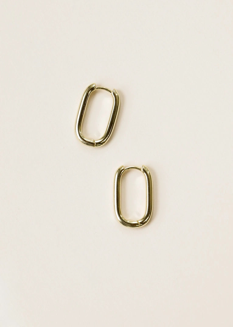 Welcome to the Golden Collection - Take your earring stack to new heights with our largest collection launch EVER Your everyday hoop just got an elevated look with a modern rectangular cut and a bold shine. 14kt gold vermeil over 925 sterling silver Ships on a crisp white card with gold foil script Outer diameter 21mm Curved ear wire and snap closure Details • Made in United States