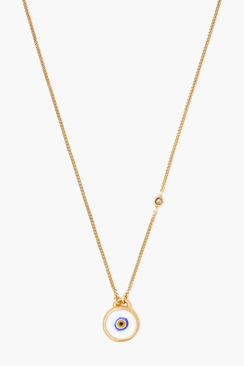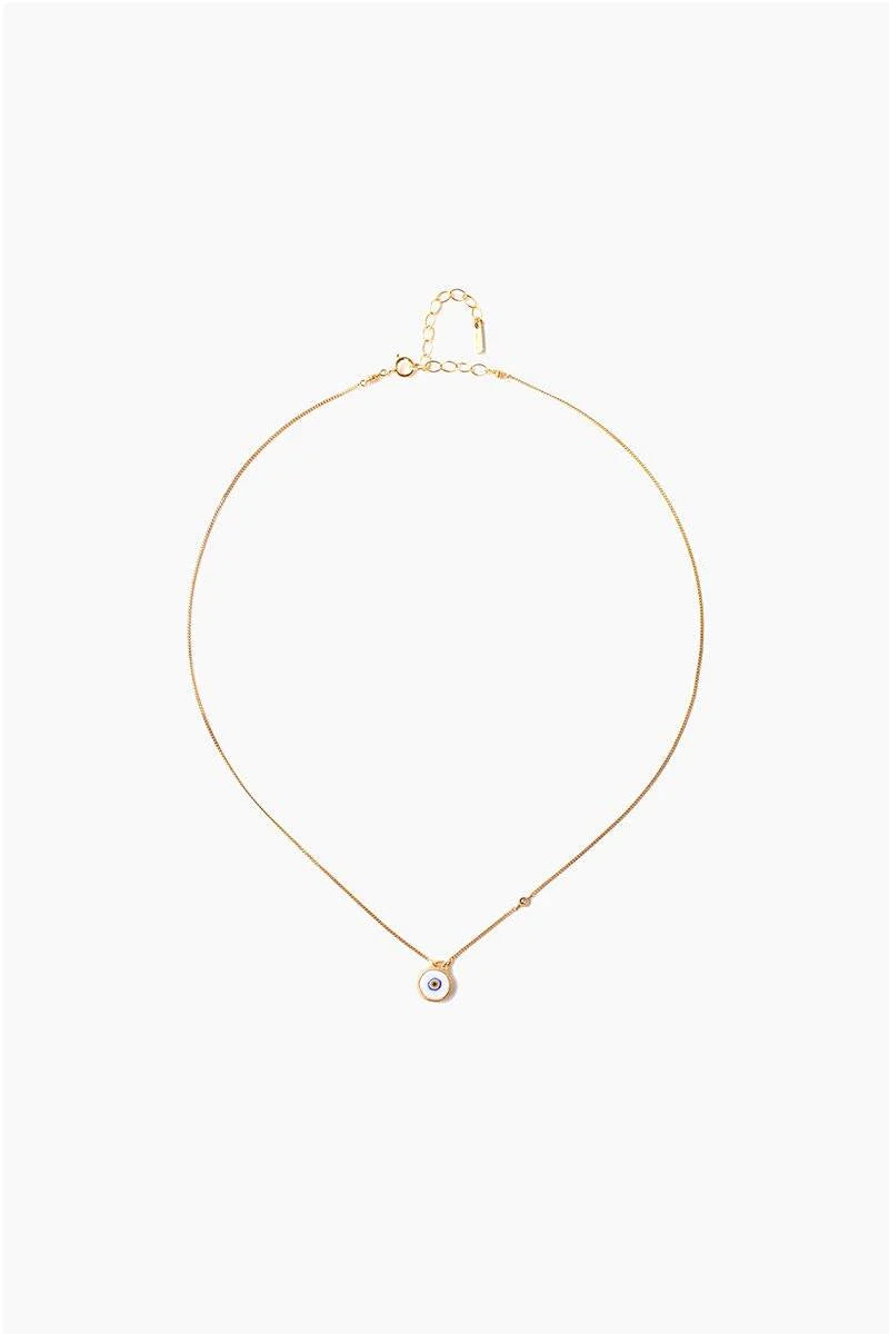 This white evil eye necklace features a traditional Turkish hand-rolled white clay evil eye on an 18k gold plated sterling silver chain with champagne diamond inlay. Wear this simple handmade necklace alone for a classic look, or layer it with longer necklaces.