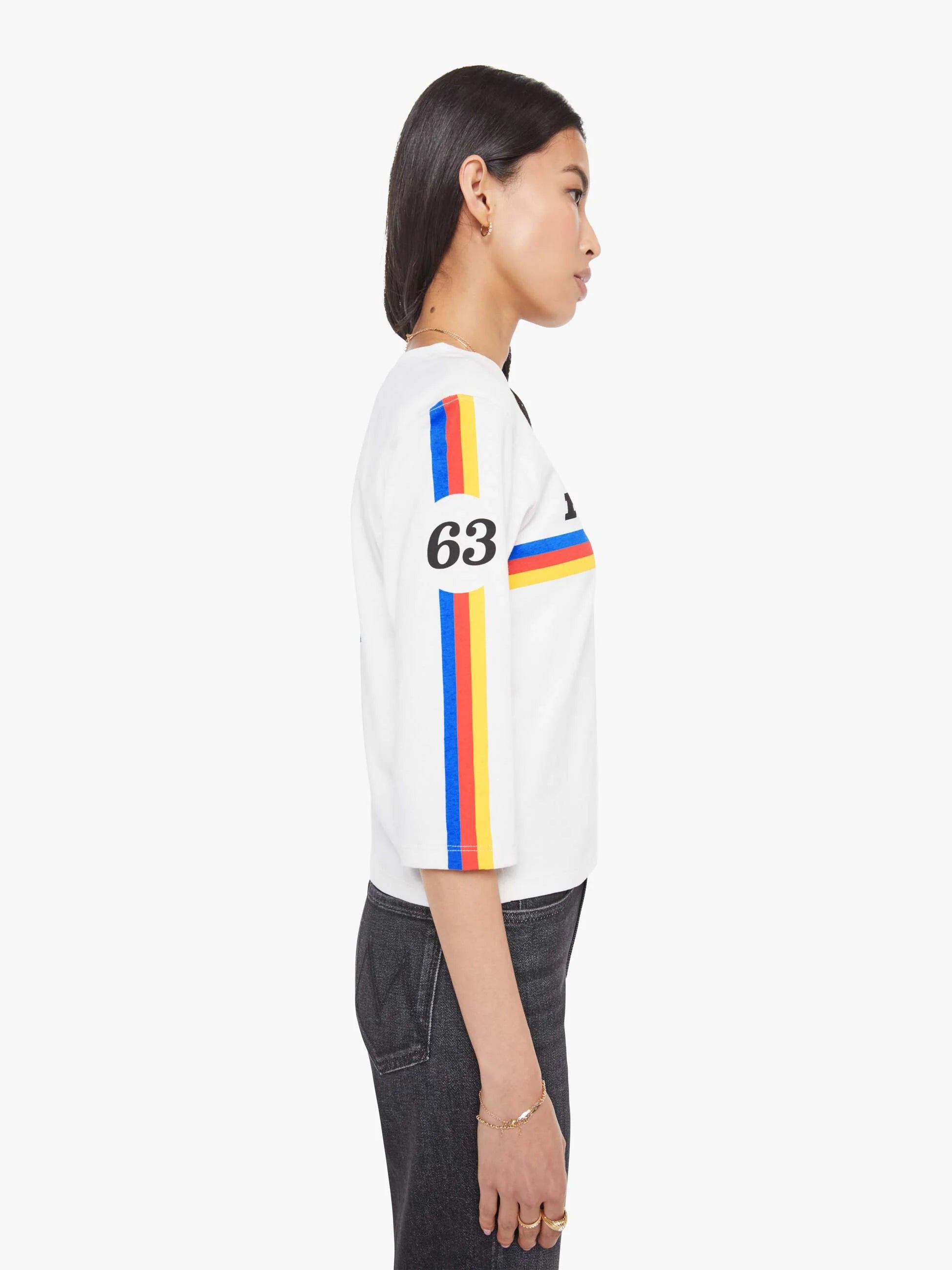 Need for speed. A crewneck tee with elbow-length sleeves and a loose, boxy fit. Made from 100% cotton, The Better Half in MOTHER 63 features colorful stripes across the chest, MOTHER's name in black on the front and a Vespa-inspired 63 graphic on the back.