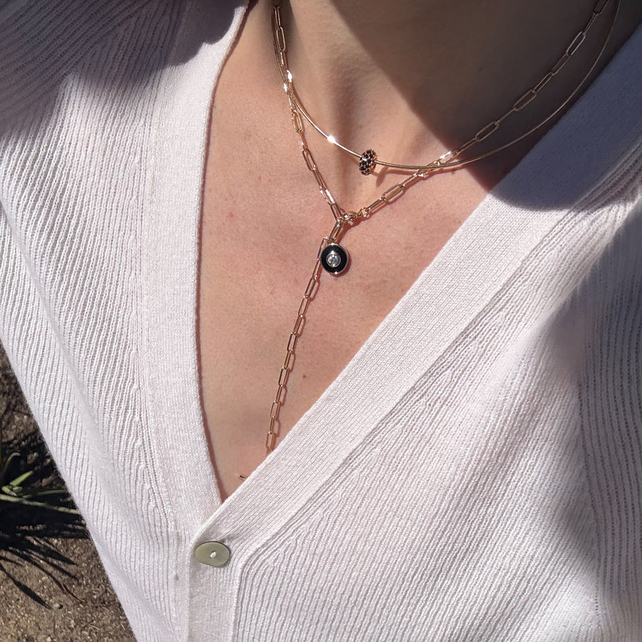 The circular cousin to our Florence charm. Stack the Olivet alongside other THATCH charms, or add it to any of our slim chains to elevate your everyday look.14k gold plated, black enamel, cubic zirconia.Chain Length: 19" (fully adjustable).