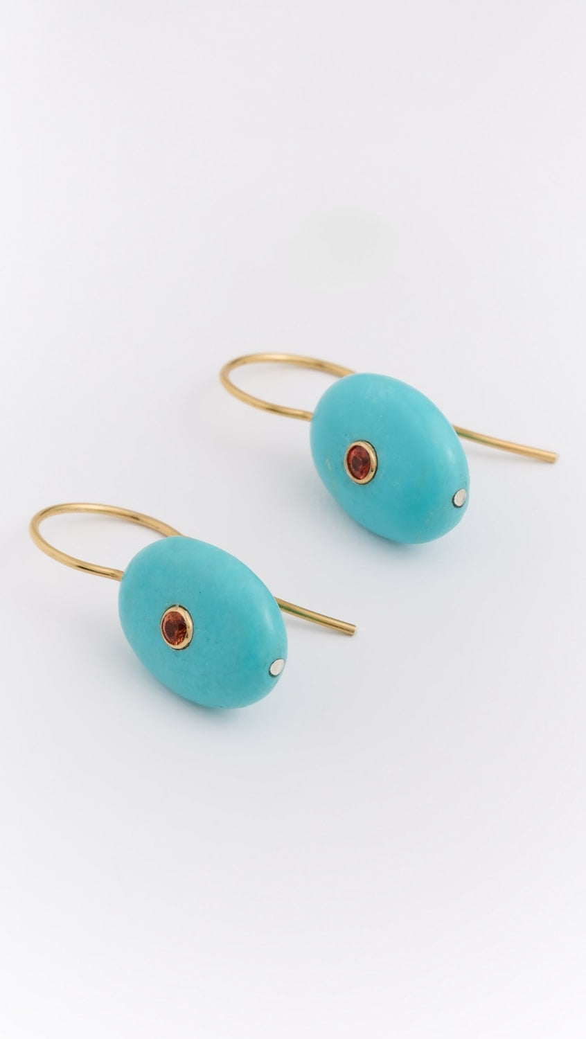 Gold French hook earrings pairing the deep blue of turquoise with an inlay of fiery orange sapphires. A precise, unexpected combination of color and stone.