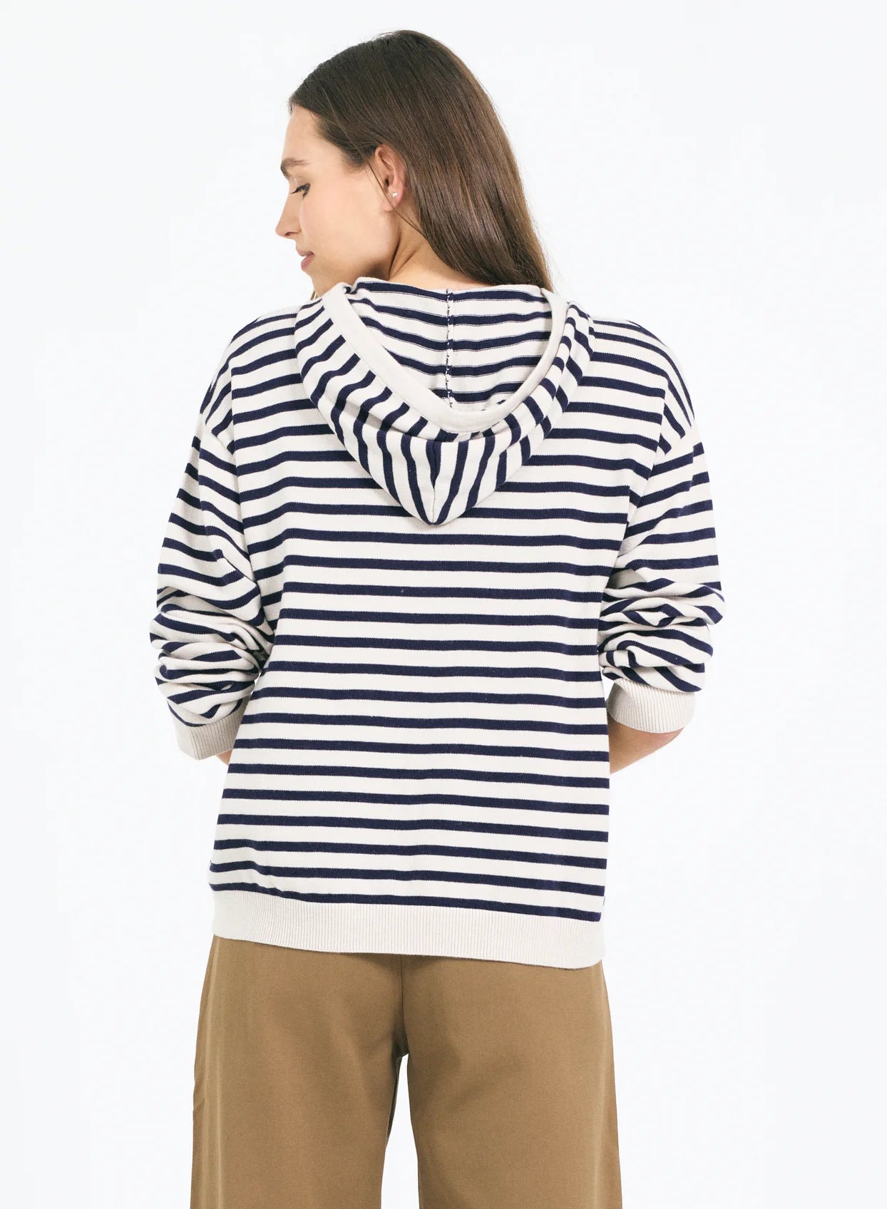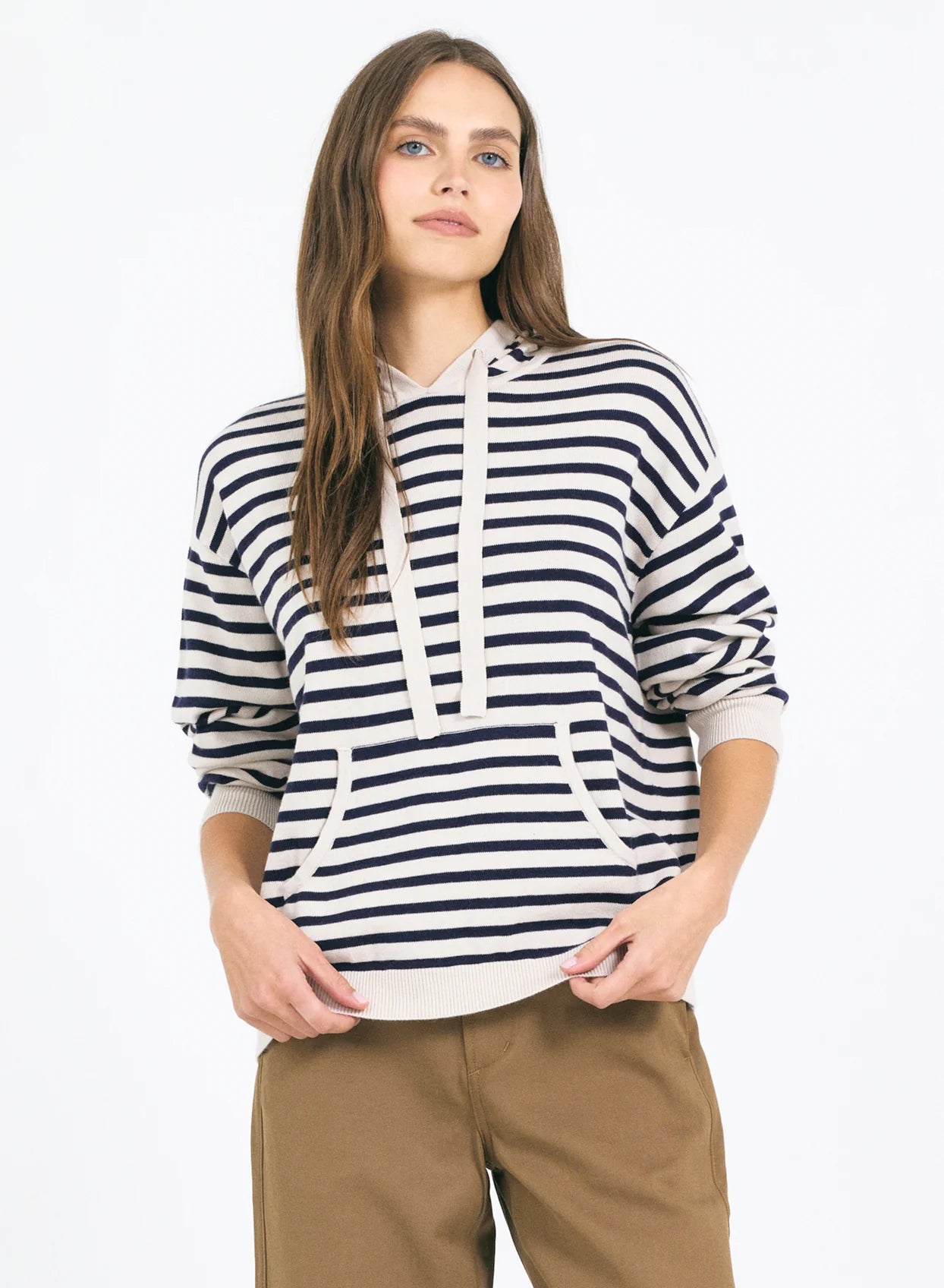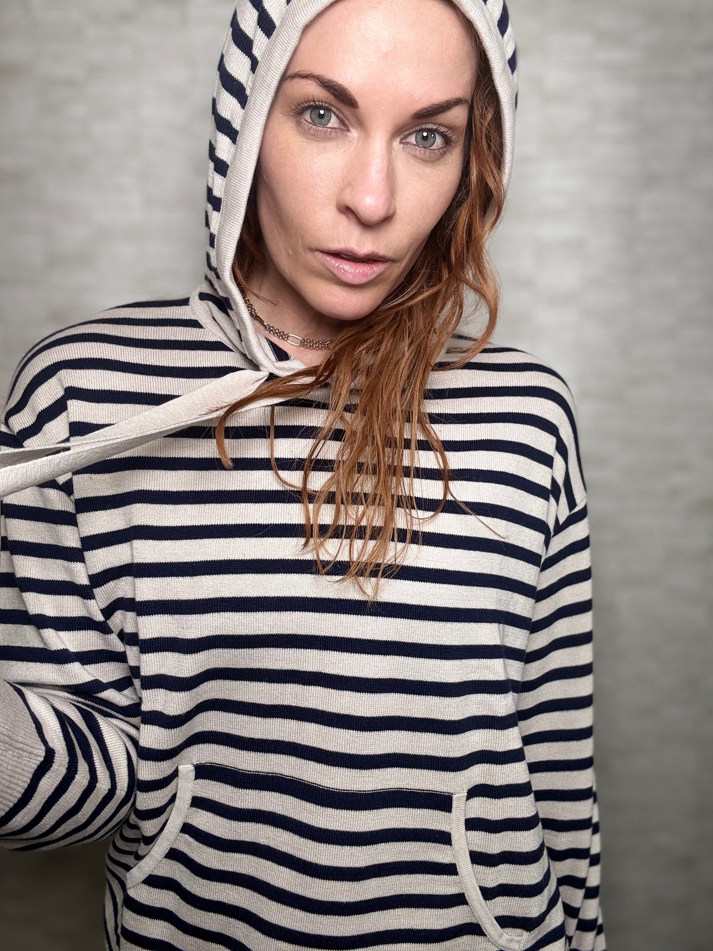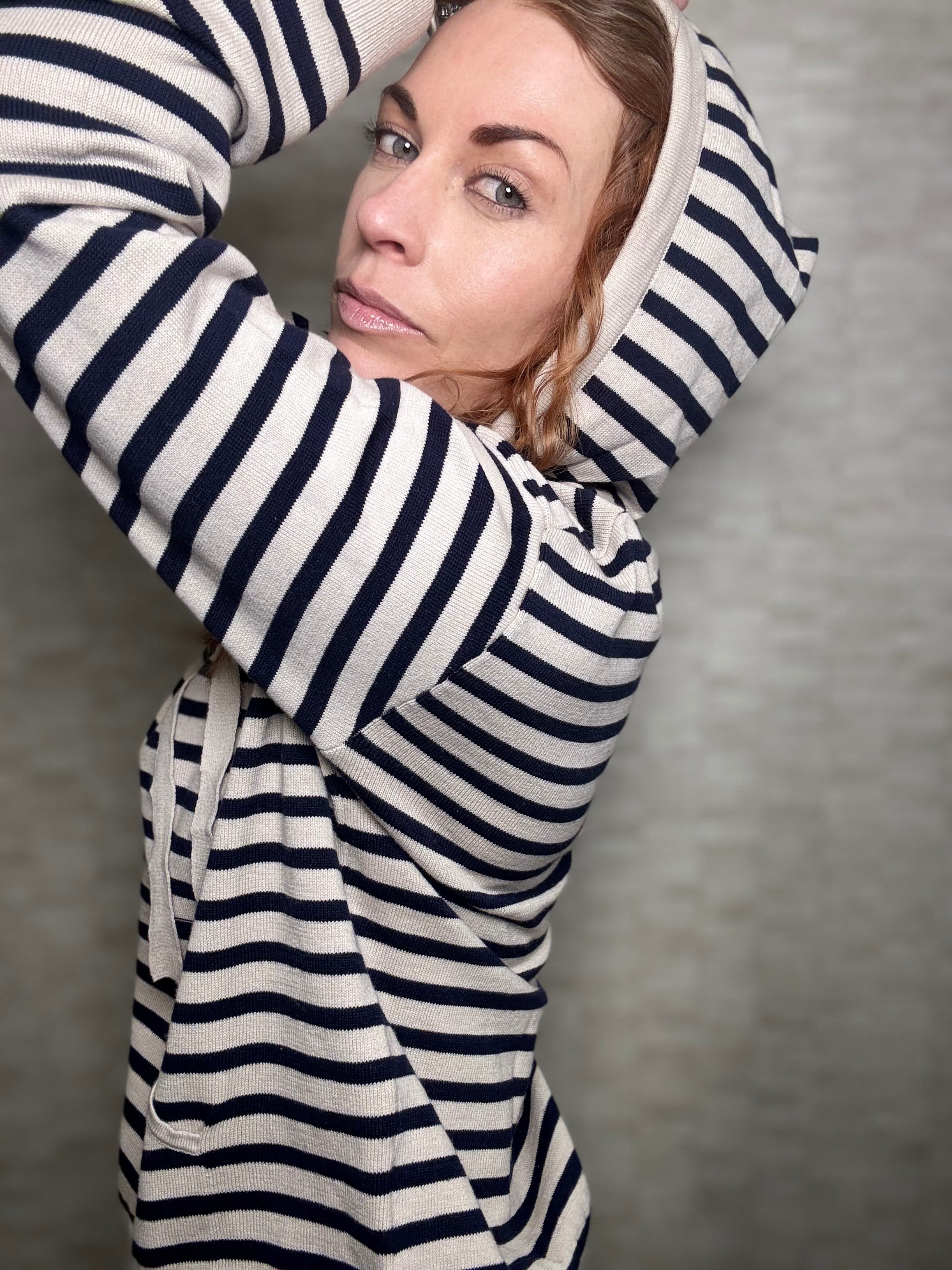 The Emerson Hoodie is a fresh take on a timeless favorite, knit from a soft, breathable blend of cotton, silk, and nylon. Featuring a relaxed fit and classic stripe pattern, it’s the perfect balance of comfort and polish. With its cozy hood and clean lines, it is made for all day comfort and is the perfect layer for at home or travel.
