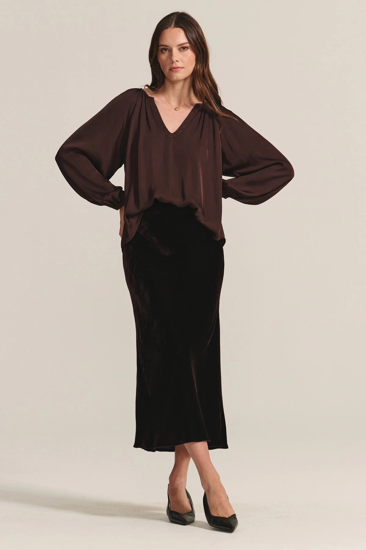 Crafted from luxurious silk velvet, this skirt features a flattering high-to-low hemline and an easy pull-on elastic waistband for a sleek, comfortable fit. Effortlessly elegant, it can be paired with any blouse for dressier occasions, from dinner parties to holiday gatherings.