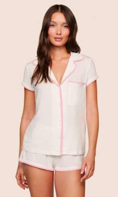 We took all the best features of our best-selling Gisele collection—the softness, the comfort, the temperature-regulating fabric—and added eye-catching artisanal whipstitch piping to both the top and bottom for a playful, Bohemian vibe. Made from TENCEL™ Modal fibers and a touch of spandex, this super soft fabric is verified by OEKO-TEX® Standard 100, meaning it’s dyed with safe and non-toxic dyes. This set has a classic slim fit short sleeve top and a low-rise cheeky short with an elastic waistband, so you can feel comfortable and stylish all at the same time. Pair Pima intimates underneath for breezy ZZZ’s.