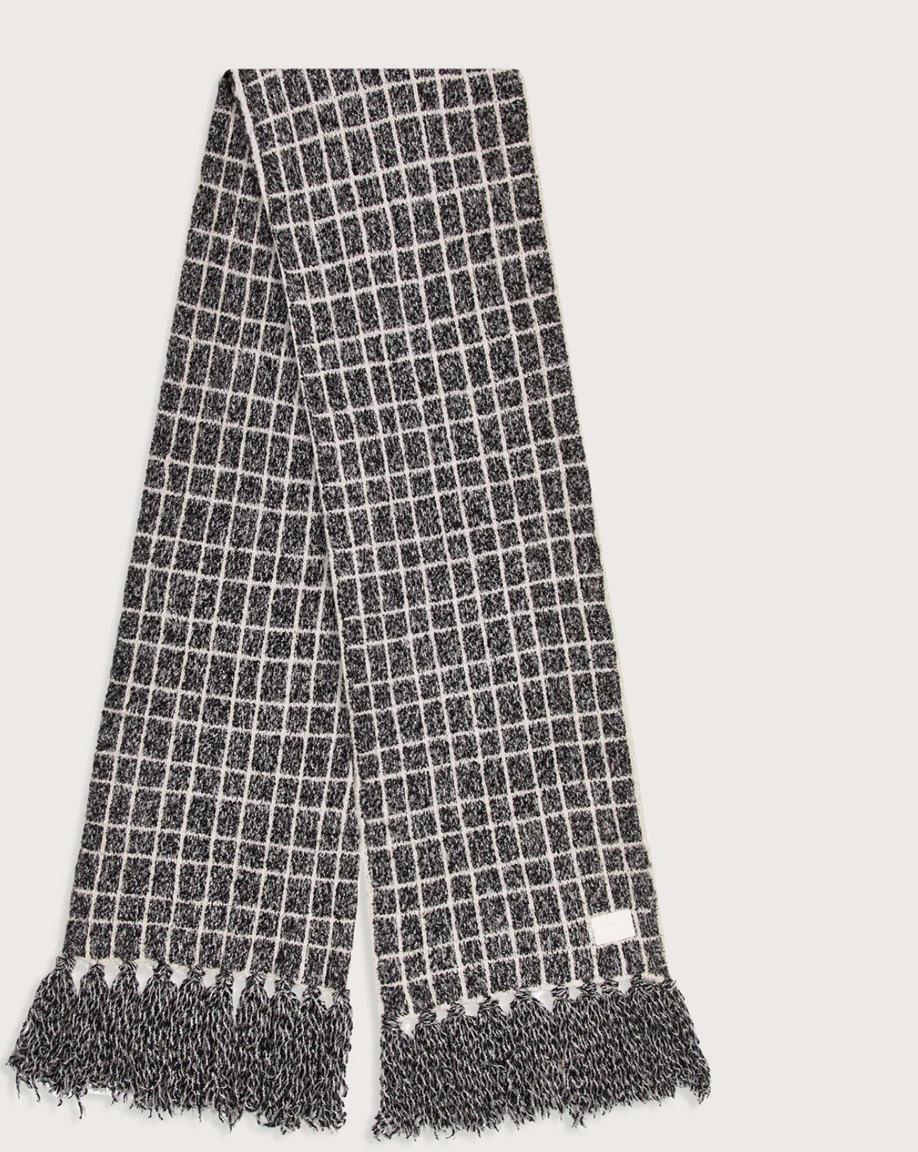 Wrap up in the Lindsey scarf to stay warm and chic through the colder months. Crafted from a Cotton Viscose Plush Bouclé yarn in a checkered pattern with fringe details, the Lindsey has a soft, elevated texture - made to match the Furley half-zip knit and Noel beanie. Style together for a coordinated look or wear solo as a statement accent. 53% Cotton 32% Nylon 13% Viscose 2% Elastane Delicate dry clean only. add pilling/snagging and fibre shedding warning label. remove any naturally occurring pilling by brushing gently with a knitwear comb or using a fabric shaver.