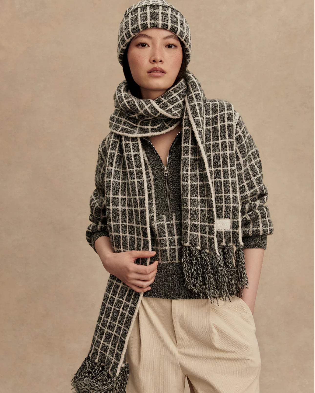 Wrap up in the Lindsey scarf to stay warm and chic through the colder months. Crafted from a Cotton Viscose Plush Bouclé yarn in a checkered pattern with fringe details, the Lindsey has a soft, elevated texture - made to match the Furley half-zip knit and Noel beanie. Style together for a coordinated look or wear solo as a statement accent.