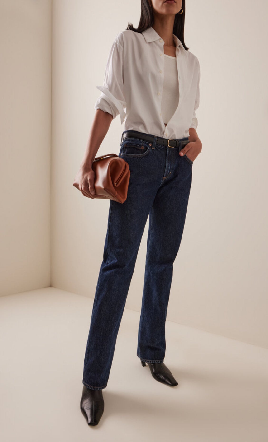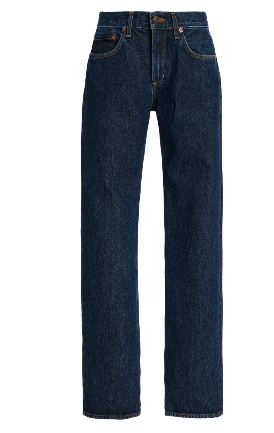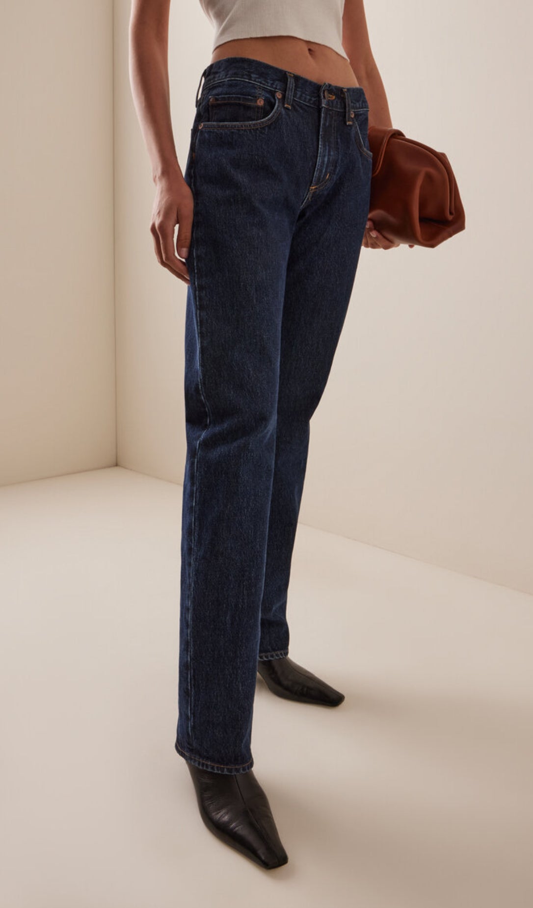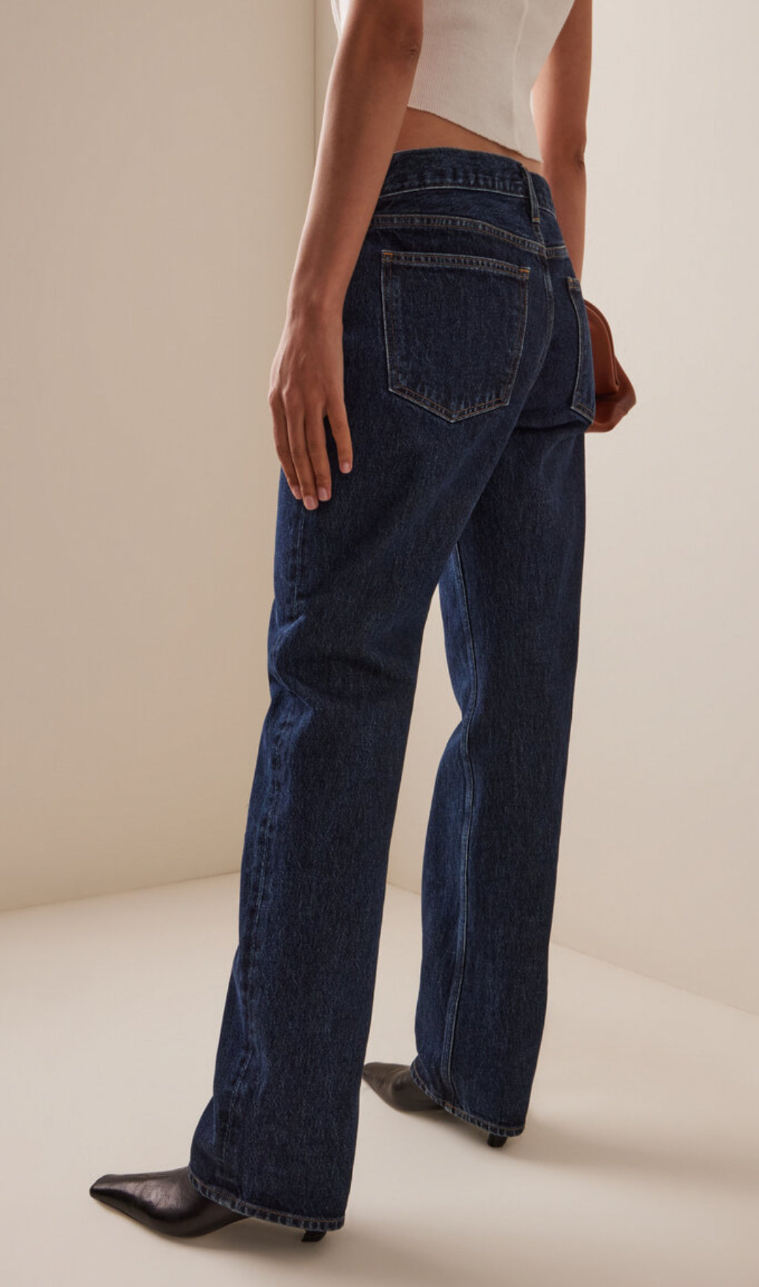 The Low Rise Slim sits low on the waist with a streamlined leg for a modern, minimal silhouette. This dark-to-medium indigo wash is finished with subtle marbling, lending a vintage-inspired edge to the clean shape. Pair with a structured top or casual knit for everyday ease.