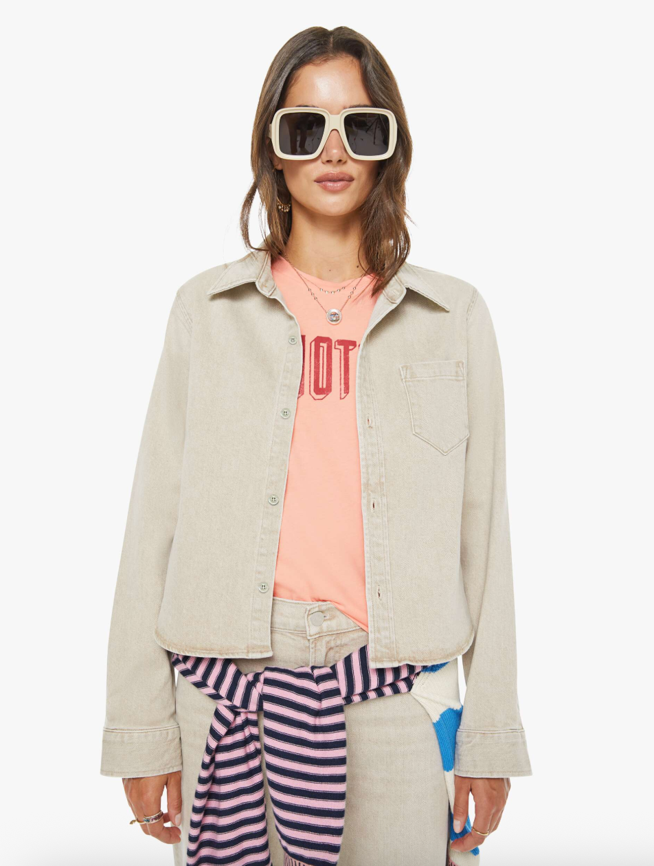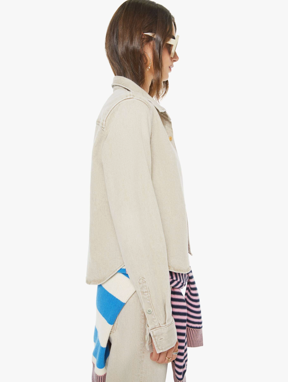 A button-up denim top with a front patch pocket and a curved, cropped hem. Made from semi-rigid SUPERIOR denim, Caramel is a faded khaki with tan stitching and shell-inspired buttons. This jacket is rigid and takes time to break in. MOTHER says patience is a virtue. Made in Los Angeles utilizing fine imported materials. 79% Cotton 20% Post-Consumer Recycled Cot 1% Elastane Model is 5'9" and wears size 26 or small bottoms and size small shirts.