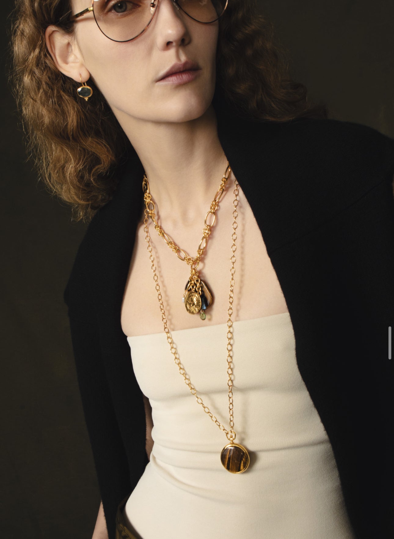 Gold plated brass charm necklace featuring tigers eye labradorite and smoky quartz. 20 - 22in. length. adjustable.
