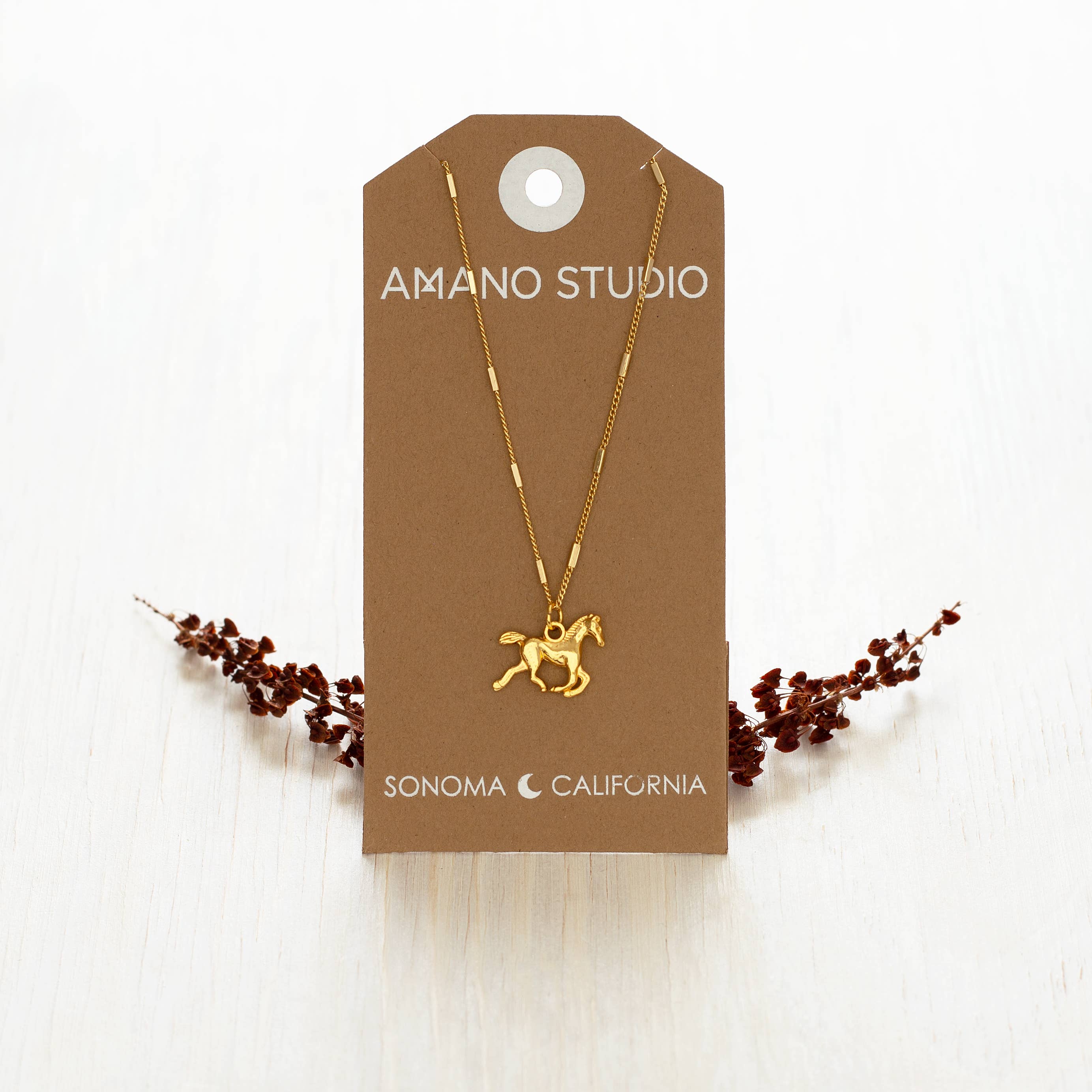 Celebrate the Year of the Horse with this beautifully rendered horse charm necklace. The horse hangs from a, vintage style 18" chain with 2" extender. Made of 14k gold plated brasss, lead and nickel free and coated to prevent tarnish. Designed and assembled in our Sonoma California studio.