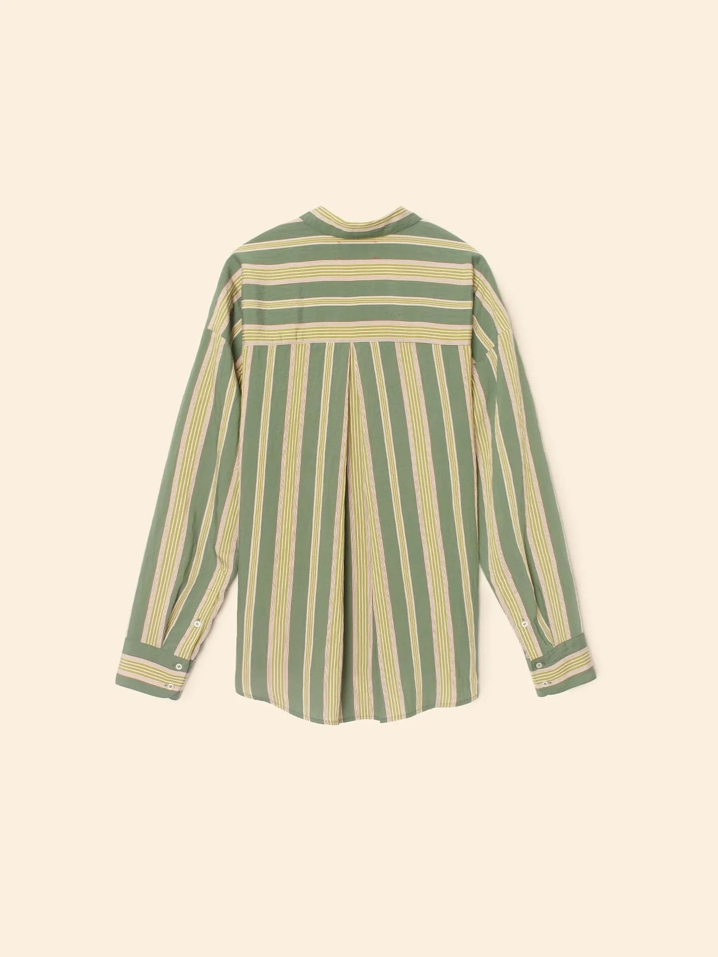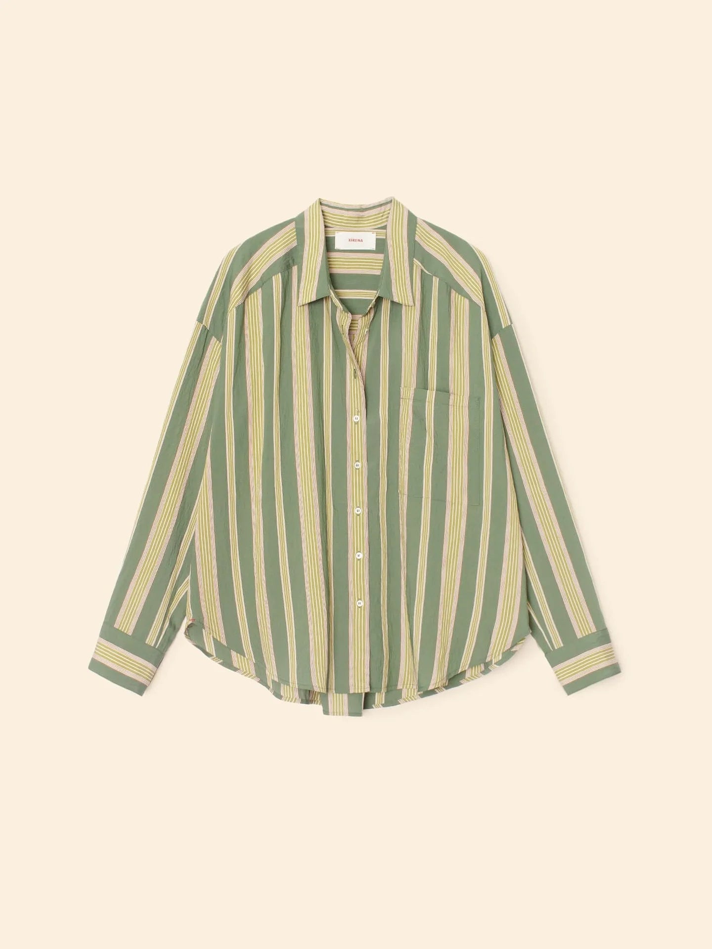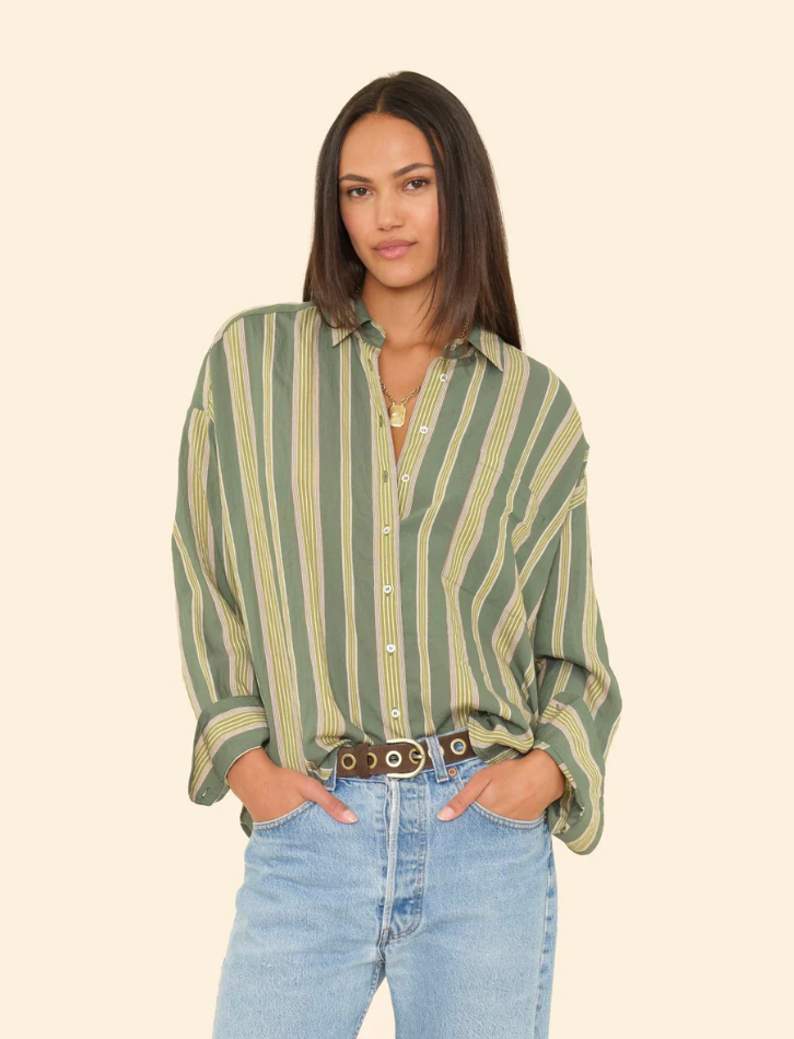 Striped Delight. Jordy is updated this season in our drapey viscose blend stripe. Jordy is an easy button-front shirt with a boxy fit, left chest pocket, and high low shirttail hem.