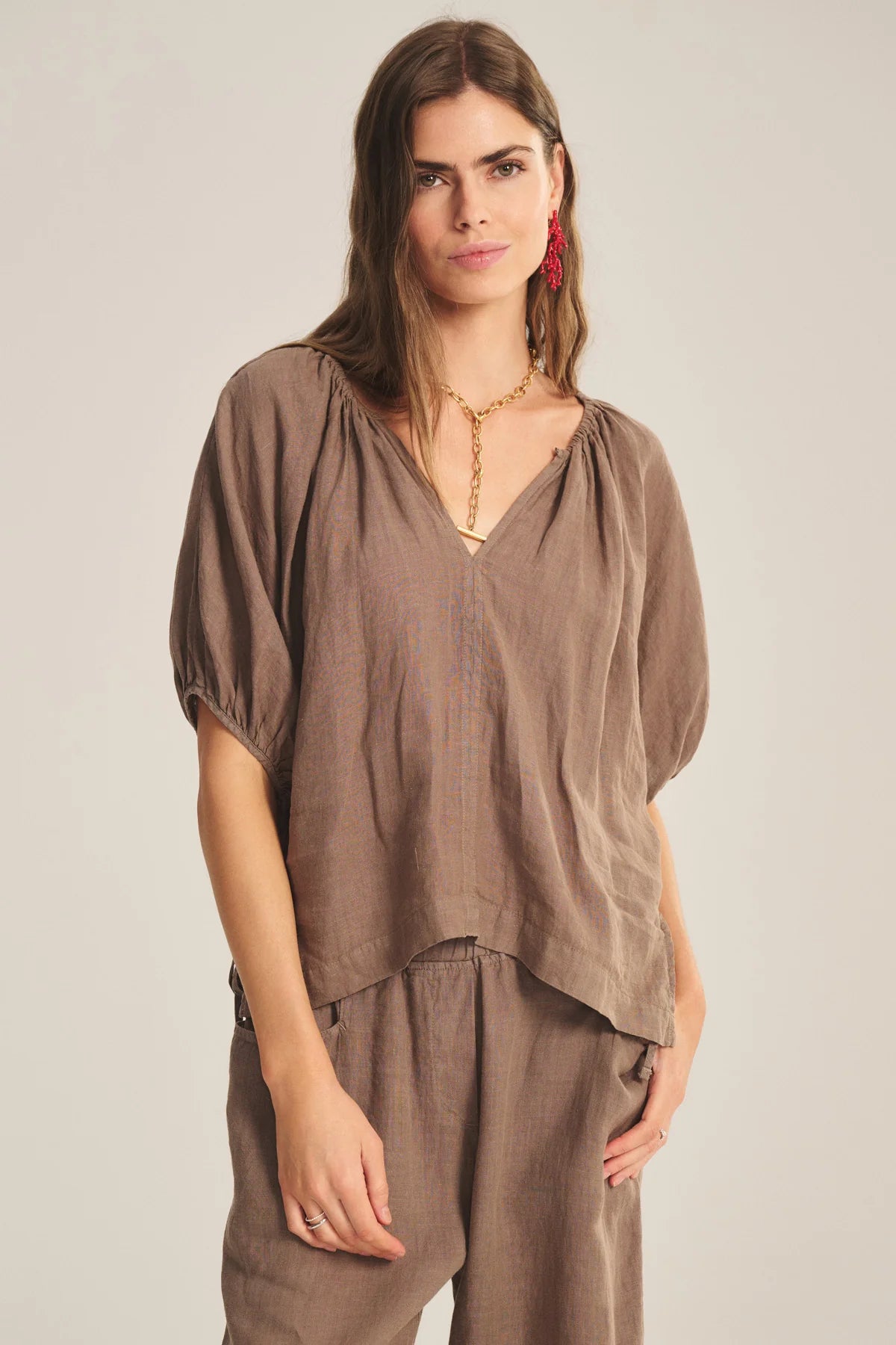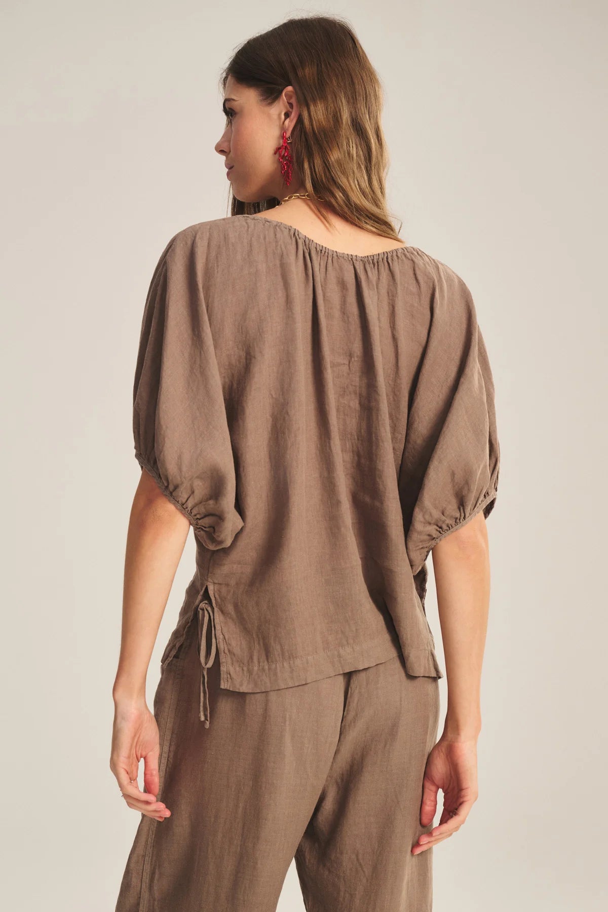 Crafted from breathable woven linen, this top offers an airy, relaxed feel with an effortlessly refined look. It features a deep V neckline with elastic ruching around the neck, soft pleating through the chest, back, and sleeves, and functional side ties that add a subtle, decorative finish