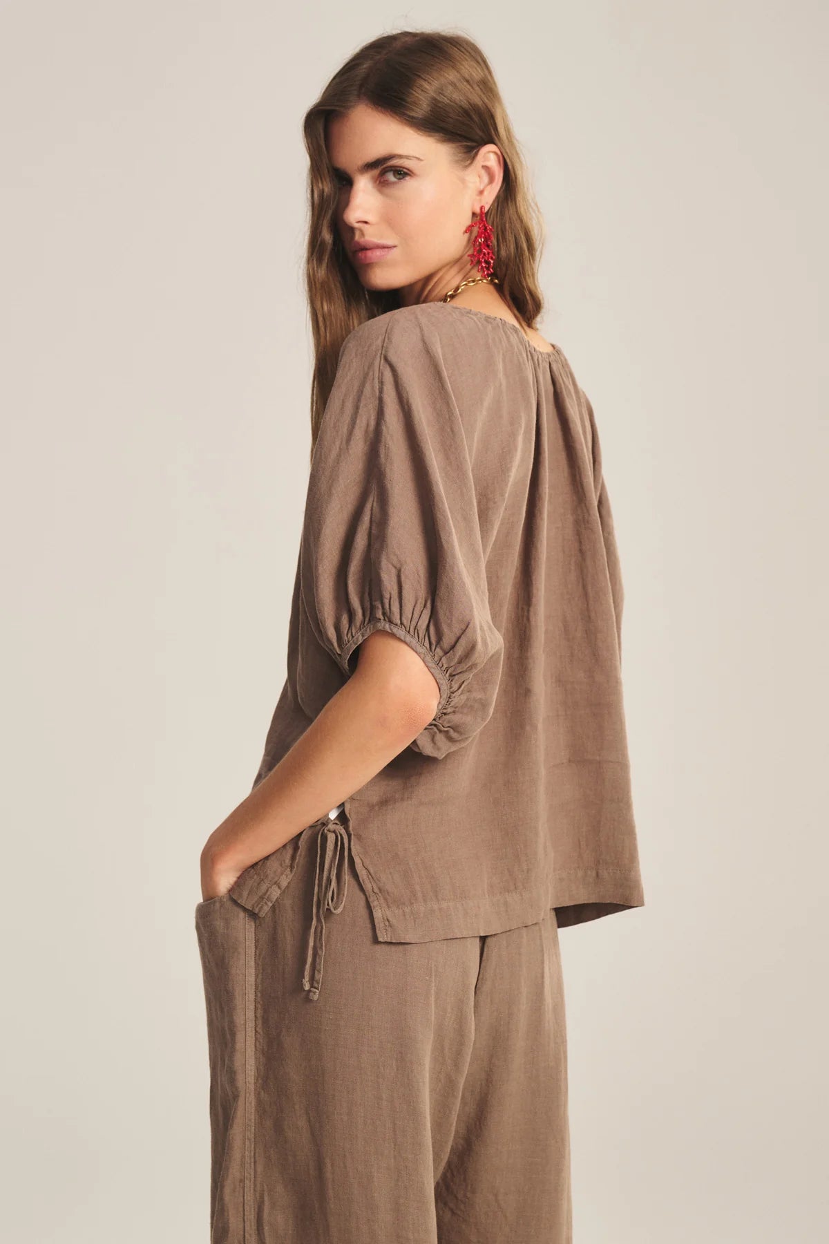 Crafted from breathable woven linen, this top offers an airy, relaxed feel with an effortlessly refined look. It features a deep V neckline with elastic ruching around the neck, soft pleating through the chest, back, and sleeves, and functional side ties that add a subtle, decorative finish 100% LINEN V-NECKLINE ELASTIC AROUND NECKLINE SIDE TIES