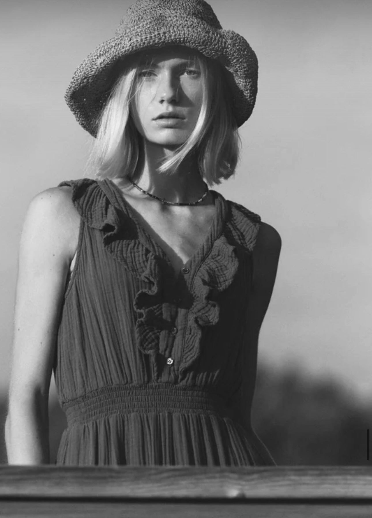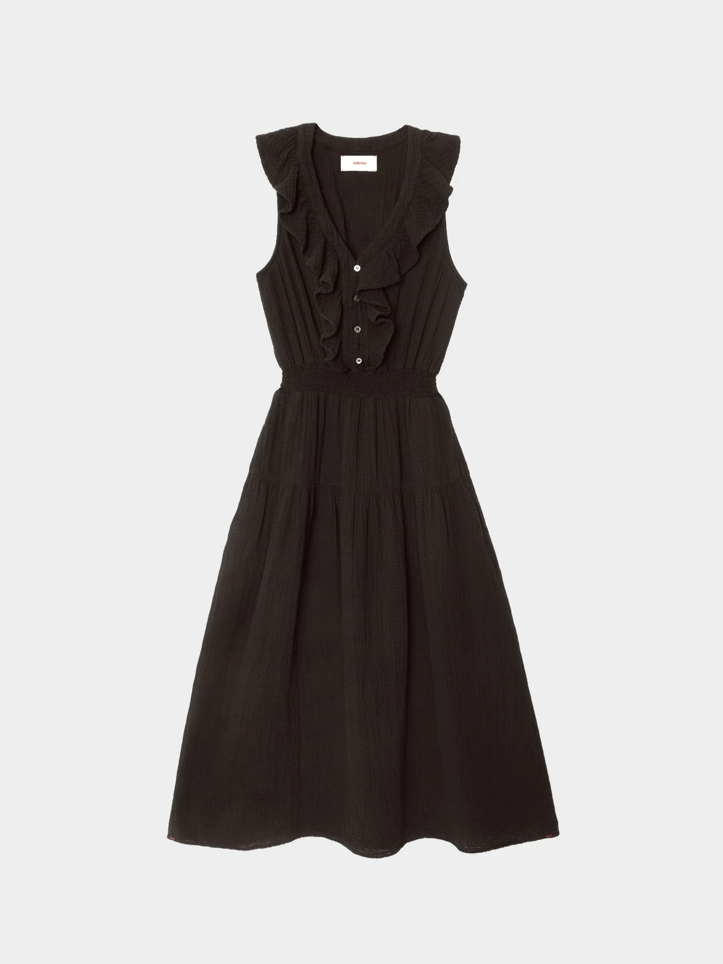 Pretty Please. Desa is made in our washed double faced cotton gauze for a soft, gently crinkled feel. This femme midi dress features a partial button-front with ruffle bib, smocked waist, and side seam pockets. Chelsea Gauze, 100% Cotton.