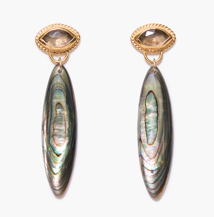 18K gold plated sterling silver earrings featuring abalone and bezel wrapped smokey quartz post back. 2in. drop.