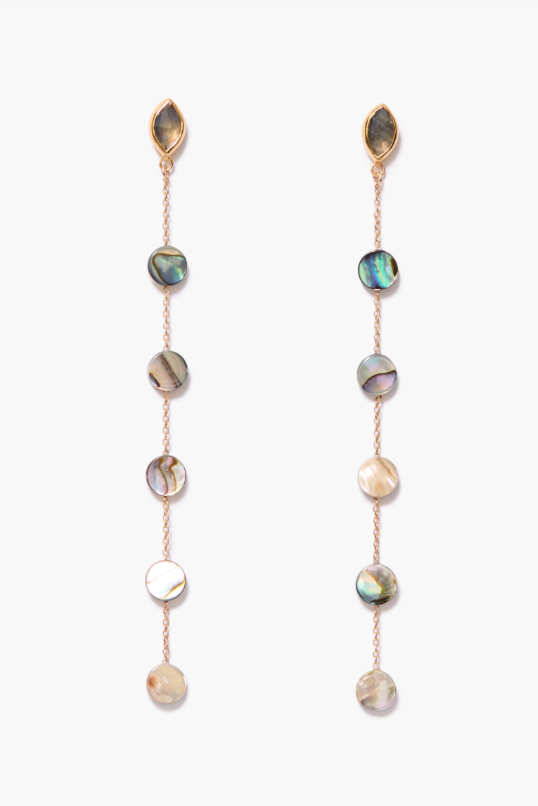 18k gold plated sterling silver post back earrings featuring bezel wrapped labradorite marquises and abalone coins. 3 1/2in. drop.