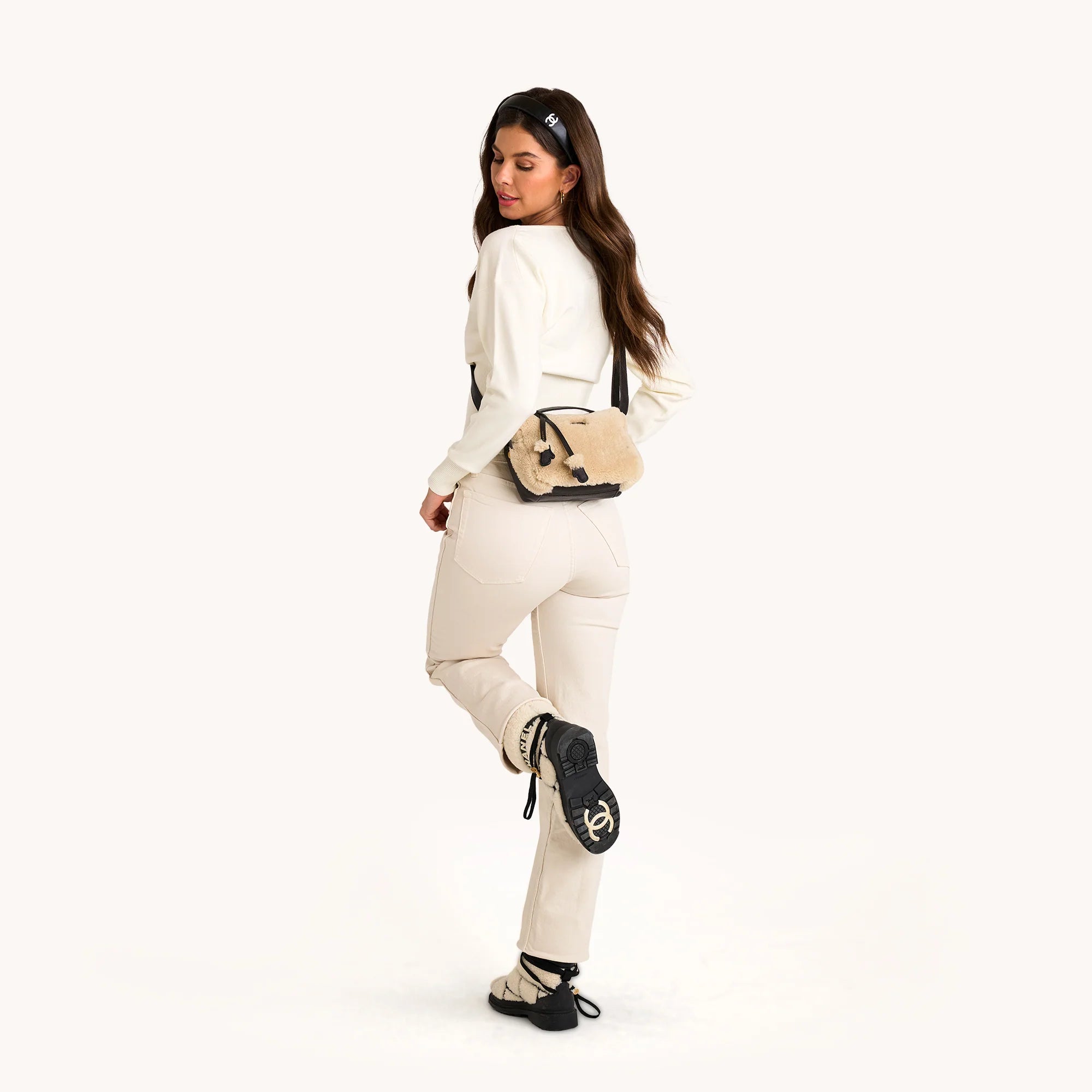 - Crafted with a natural, cool-toned beige double-faced UK shearling lambskin and a mid-tone grey brown pebble leather with neutral undertones
